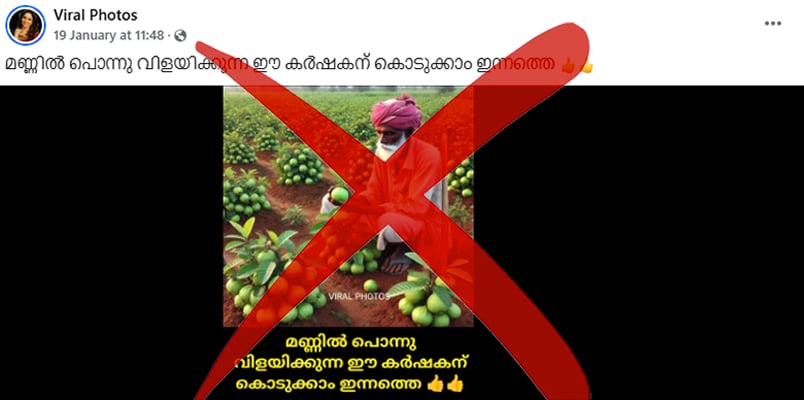 കുഞ്ഞ് ചെടിയില് ഇലകളേക്കാള് കൂടുതല് പേരക്കകള് കായ്ച്ചു കിടക്കുന്നതും ഒരു കര്ഷകന് അതിന്റെ അടുത്ത് ഇരിക്കുന്നതുമായ ചിത്രം എഐ നിര്മിതമാണ്.