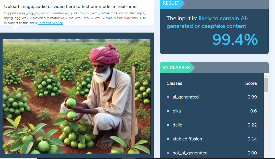 ഈ ഫോട്ടോ എഐ നിര്മിതമോ എന്നുറപ്പിക്കാന് ആര്ട്ടിഫിഷ്യല് ഇന്റലിജന്സ് ഫോട്ടോകള് തിരിച്ചറിയുന്ന ഓണ്ലൈന് ടൂളുകളുടെ സഹായം തേടി. ഈ ഫോട്ടോ എഐ നിര്മിതമാകാന് 99.4 ശതമാനം സാധ്യതയാണ് ഹൈവ് മോഡറേഷന് ടൂള് പരിശോധനാ ഫലമായി തന്നത്. ഇതോടെ ഫോട്ടോയുടെ വസ്തുത ഉറപ്പിക്കാനായി.