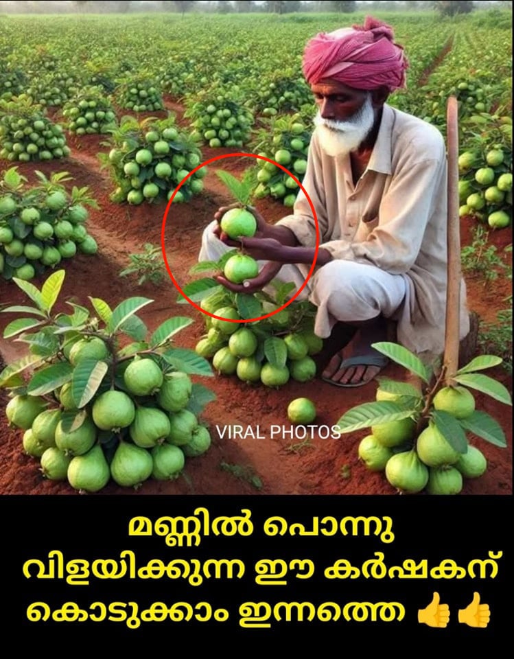 'മണ്ണില് പൊന്നു വിളയിക്കുന്ന ഈ കര്ഷകന് കൊടുക്കാം ഇന്നത്തെ ലൈക്ക്' എന്ന തലക്കെട്ടിലാണ് ചിത്രം 'വൈറല് ഫോട്ടോസ്' എന്ന ഫേസ്ബുക്ക് പേജില് പങ്കുവെച്ചിരിക്കുന്നത്. കാണുന്നവരെല്ലാം തലയില് കൈവെച്ച് അത്ഭുതപ്പെടുന്ന തരത്തിലാണ് പേരച്ചെടികളില് നിറയെ പേരക്ക കായ്ച്ച് കിടക്കുന്നത്. ഇലകളേക്കാള് കായകള് എന്ന പ്രയോഗം ശരിയാണെന്ന് തോന്നിക്കുന്നതാണ് ഈ ചിത്രം.