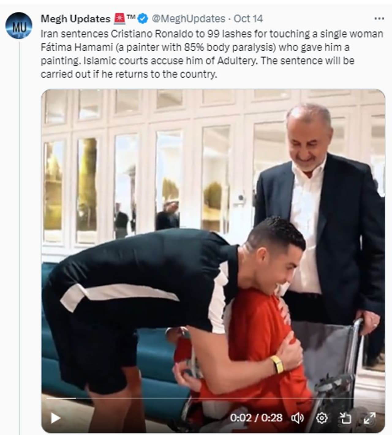 85 ശതമാനം ശാരീരിക വെല്ലുവിളി നേരിടുന്ന അവിവാഹിതയായ ഇറാനിയന് ചിത്രകാരി ഫാത്തിമ ഹമാമിയെ സ്പര്ശിച്ചതിന് ക്രിസ്റ്റ്യാനോ റൊണാള്ഡോയെ 99 ചാട്ടവാറടിക്ക് വിധിച്ചു എന്നാണ് മെഗ് അപ്ഡേറ്റ്സ് എന്ന എക്സ് (പഴയ ട്വിറ്റര്) ഹാന്ഡിലില് നിന്ന് വന്ന കുറിപ്പ്. ക്രിസ്റ്റ്യാനോയുടെയും ഫാത്തിമയുടെയും ചിത്രം സഹിതമായിരുന്നു 2023 ഒക്ടോബര് 14-ാം തിയതി ഈ ട്വീറ്റ്. 'ക്രിസ്റ്റ്യാനോയെ ഇസ്ലാമിക കോടതി വ്യഭാചാര കുറ്റത്തിനാണ് ശിക്ഷിച്ചത്. ക്രിസ്റ്റ്യാനോ ഇറാനിലേക്ക് തിരിച്ചെത്തിയാല് ഈ ശിക്ഷ അനുഭവിക്കേണ്ടിവരും' എന്നും ട്വീറ്റില് പറയുന്നുണ്ടായിരുന്നു. ഇതേ കാര്യം വിവിധ മാധ്യമങ്ങള് വാര്ത്തയാക്കുകയും ചെയ്തു. ഇറാനിയന് ചിത്രകാരിയെ ആലിംഗനം ചെയ്തതിനാണ് ക്രിസ്റ്റ്യാനോയ്ക്ക് 99 ചാട്ടയടി വിധിച്ചത് എന്നായിരുന്നു ന്യൂ വേള്ഡ് ന്യൂസ് 2023 ഒക്ടോബര് 13-ാം തിയതി വെരിഫൈഡ് ട്വിറ്റര് ഹാന്ഡിലില് നിന്ന് ട്വീറ്റ് ചെയ്തത്.