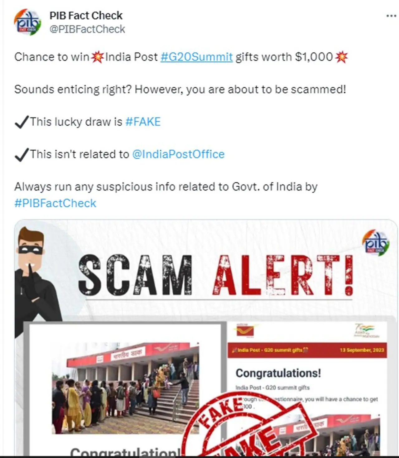ഇതോടൊപ്പം പ്രസ് ഇന്ഫര്മേഷ്യന് ബ്യൂറോയുടെ ഫാക്ട് ചെക്ക് വിഭാഗവും വ്യാജ സന്ദേശത്തെ പൊളിച്ചടുക്കിയിട്ടുണ്ട്. 'ഈ ലക്കി ഡ്രോ വ്യാജമാണ്. ഇന്ത്യാ പോസ്റ്റുമായി ഇതിന് യാതൊരു ബന്ധവുമില്ല' എന്ന് പ്രസ് ഇന്ഫര്മേഷ്യന് ബ്യൂറോയുടെ ഫാക്ട് ചെക്ക് വിഭാഗം ട്വീറ്റ് ചെയ്തു. ഇന്ത്യാ പോസ്റ്റിന്റെ പേരില് ഇതാദ്യമായല്ല സാമൂഹ്യമാധ്യമങ്ങളിലൂടെ വ്യാജ പ്രചാരണം. മുമ്പും ഇത്തരം തട്ടിപ്പുകള് നടന്നിട്ടുണ്ട്.