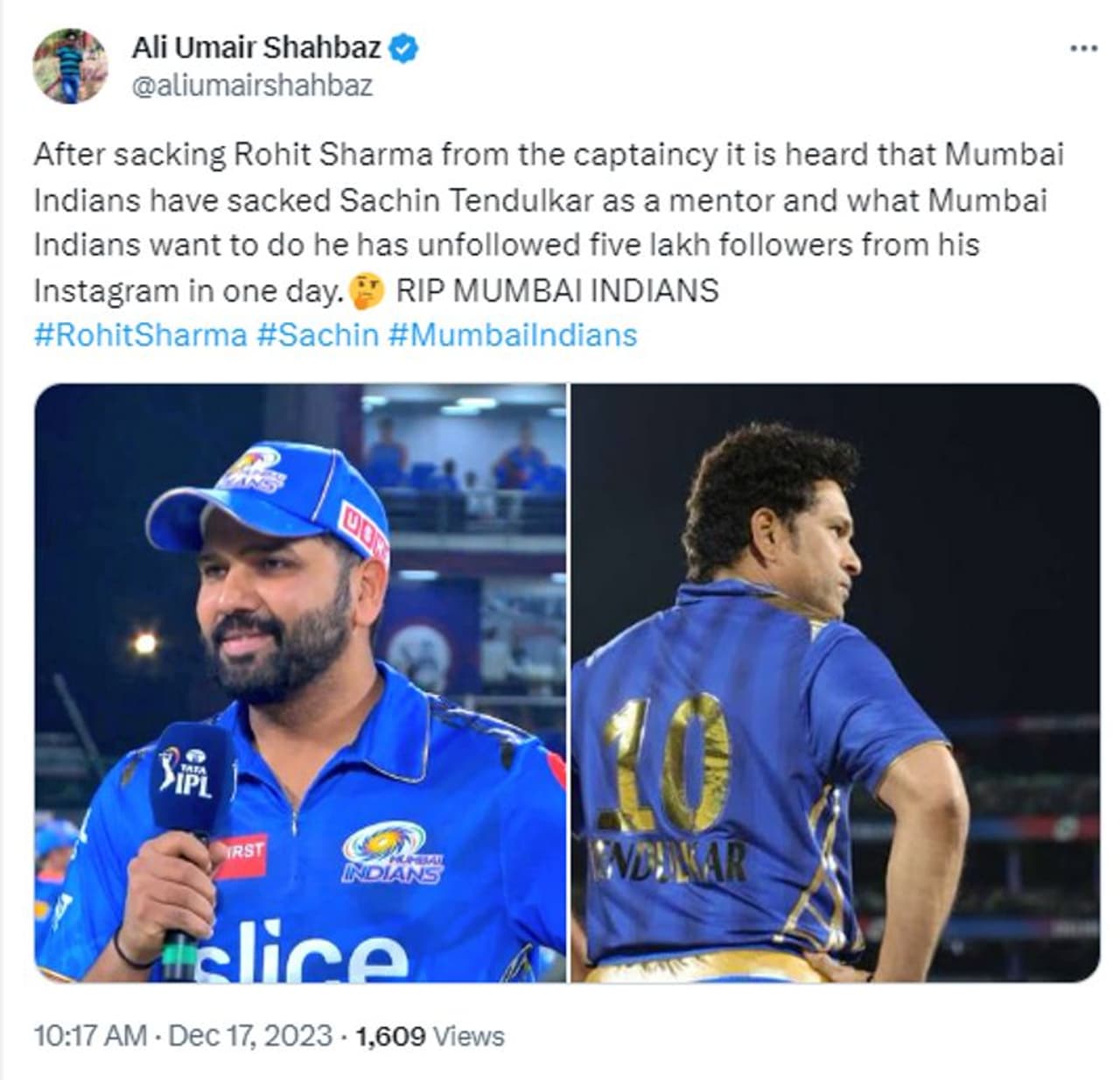 രോഹിത് ശര്മ്മയെ ക്യാപ്റ്റന് സ്ഥാനത്ത് നിന്ന് മാറ്റിയ ശേഷം മുംബൈ ഇന്ത്യന്സ് സച്ചിന് ടെന്ഡുല്ക്കറെ ഉപദേഷ്ടാവ് സ്ഥാനത്ത് നിന്ന് നീക്കിയതായി കേള്ക്കുന്നു എന്നാണ് മറ്റൊരു ട്വീറ്റില് പറയുന്നത്.