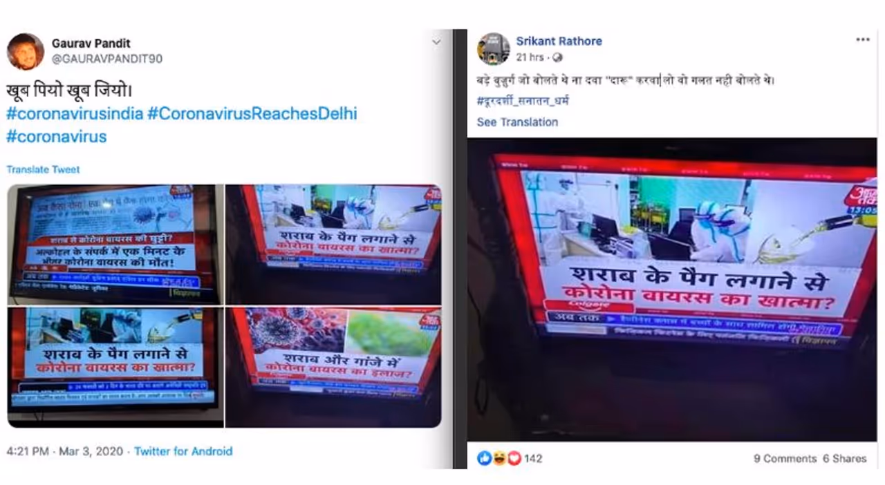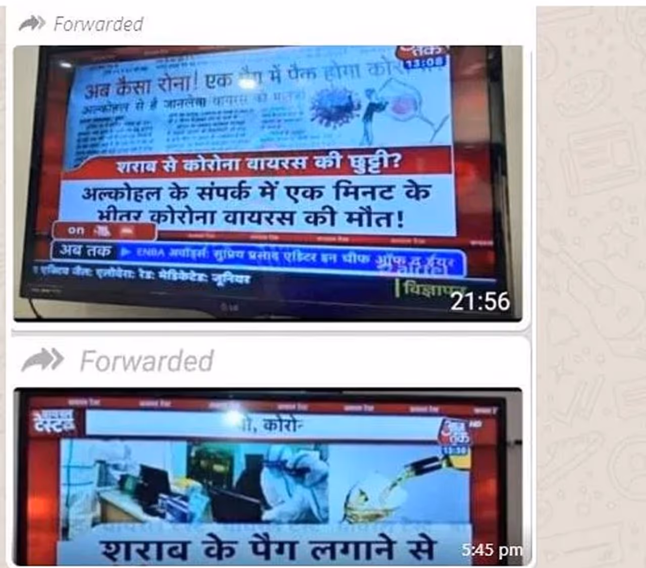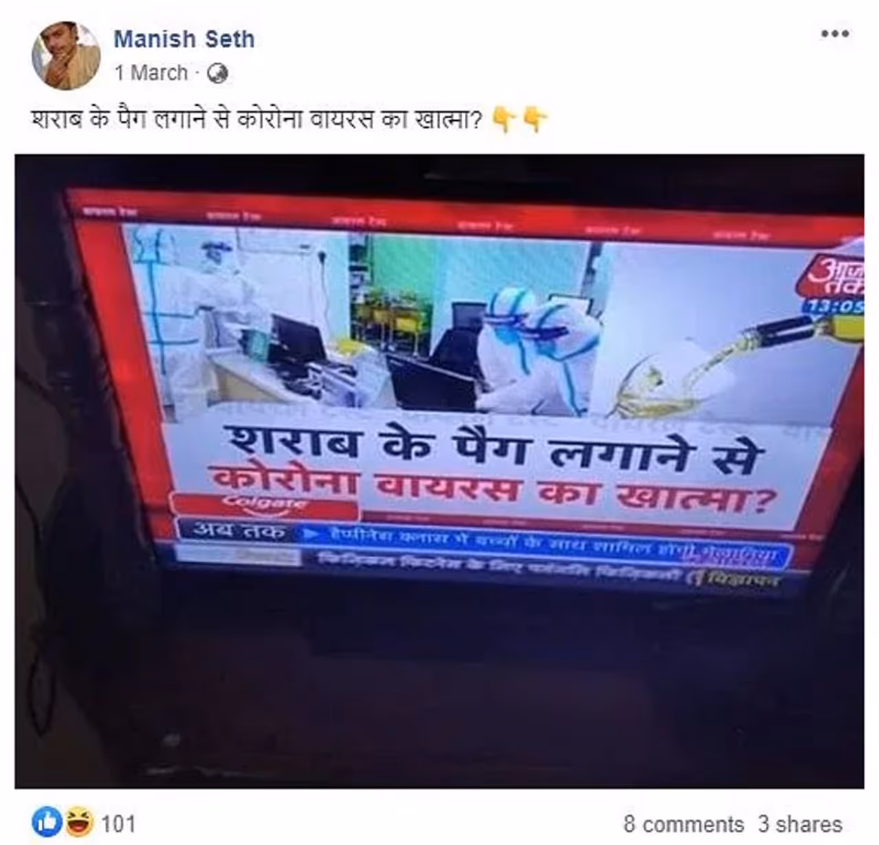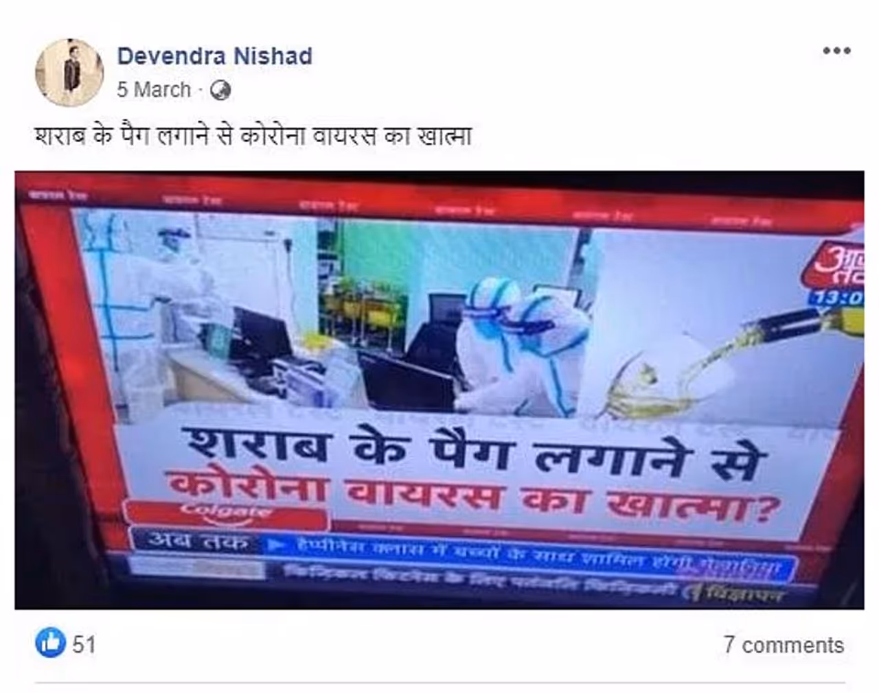 മദ്യം കൊറോണ വൈറസിനെ തുരത്തുമെന്ന് നേരത്തെയും പ്രചാരണമുണ്ടായിരുന്നു. എന്നാല് ഇക്കുറി ഒരു സ്ക്രീന്ഷോട്ട് സഹിതമാണ് പ്രചാരണം. ആജ് തക് ടീവിയില് വന്ന വാര്ത്തയുടെ സ്ക്രീന്ഷോട്ടാണ് ഇത് എന്ന് പറയപ്പെടുന്നു. നിരവധി പേര് ഈ സ്ക്രീന്ഷോട്ട് സാമൂഹ്യമാധ്യമങ്ങളില് ഷെയര് ചെയ്തു.
