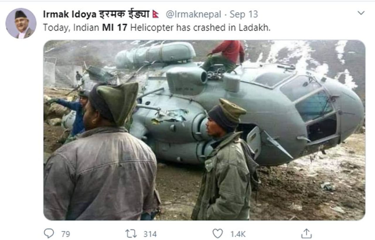ഇങ്ങനെയൊരു അപകടം സമീപകാലത്തൊന്നും ലഡാക്കില് നടന്നിട്ടില്ല. രണ്ട് വര്ഷം മുമ്പ് ഉത്തരാഖണ്ഡിലെ കേദാര്നാഥില് നടന്ന അപകടത്തിന്റെ ചിത്രം സഹിതമാണ് ഇപ്പോള് പാകിസ്ഥാന് നടത്തുന്ന പ്രചാരണം. 2018 ഏപ്രിലില് ലാന്ഡിംഗിനിടെയാണ് ഹെലികോപ്റ്റര് തകര്ന്നത്. അന്നത് ദേശീയ മാധ്യമങ്ങള് വലിയ പ്രാധാന്യത്തോടെ റിപ്പോര്ട്ട് ചെയ്തിരുന്നു.