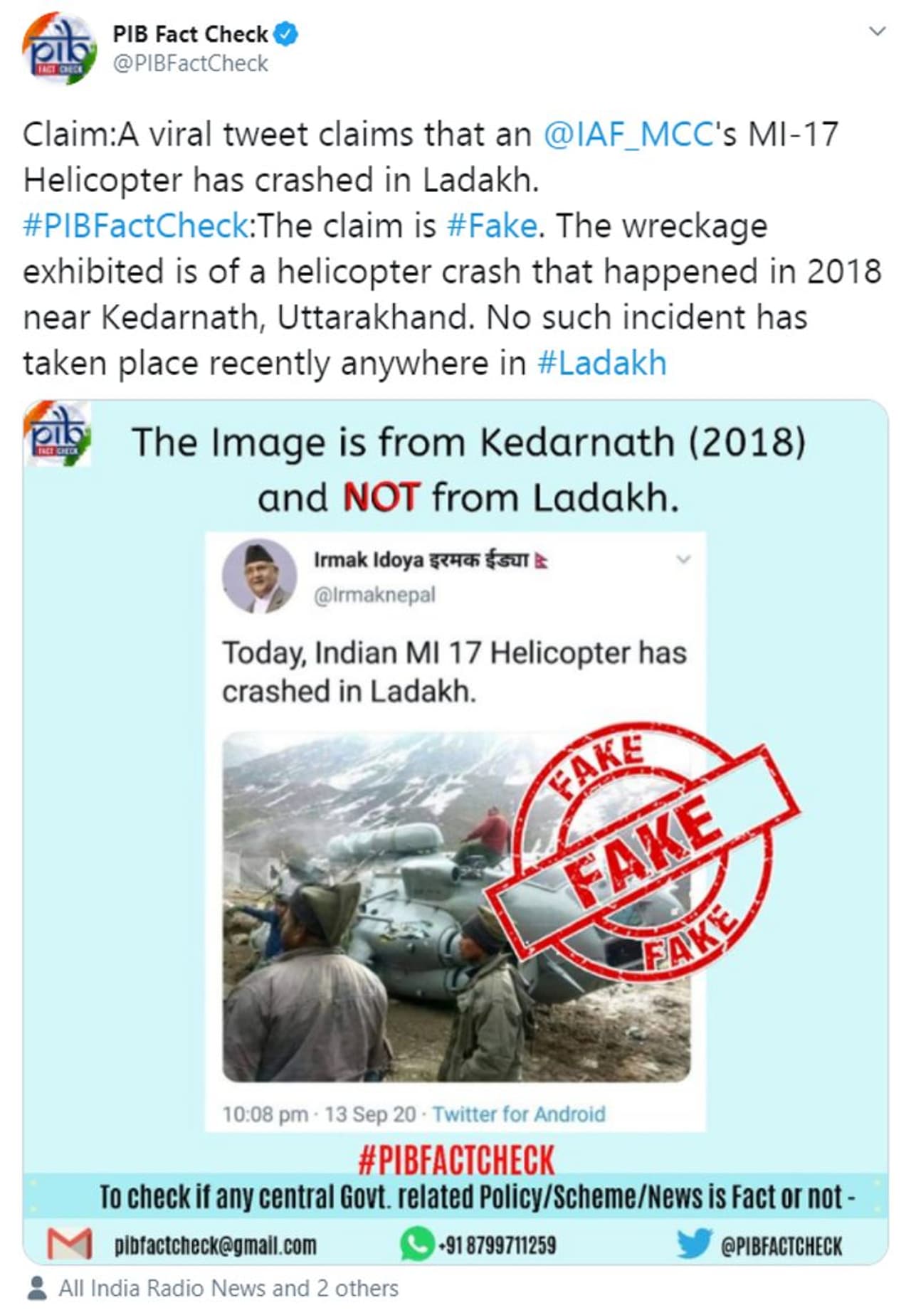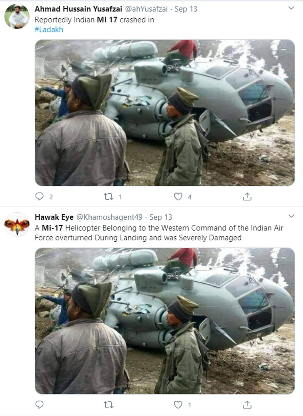 ലഡാക്കില് MI-17 ഹെലികോപ്റ്റര് തകര്ന്നു എന്ന സന്ദേശം ചിത്രം സഹിതം ട്വിറ്റര് അടക്കമുള്ള സാമൂഹ്യമാധ്യമങ്ങളിലാണ് പ്രചരിച്ചത്. പാകിസ്ഥാനില് നിന്നുള്ള മാധ്യമപ്രവര്ത്തകരടക്കം ഇത് പ്രചരിപ്പിച്ചു. തെളിവുകളായി ട്വീറ്റുകളുടെ സ്ക്രീന്ഷോട്ടുകള് ചുവടെ.