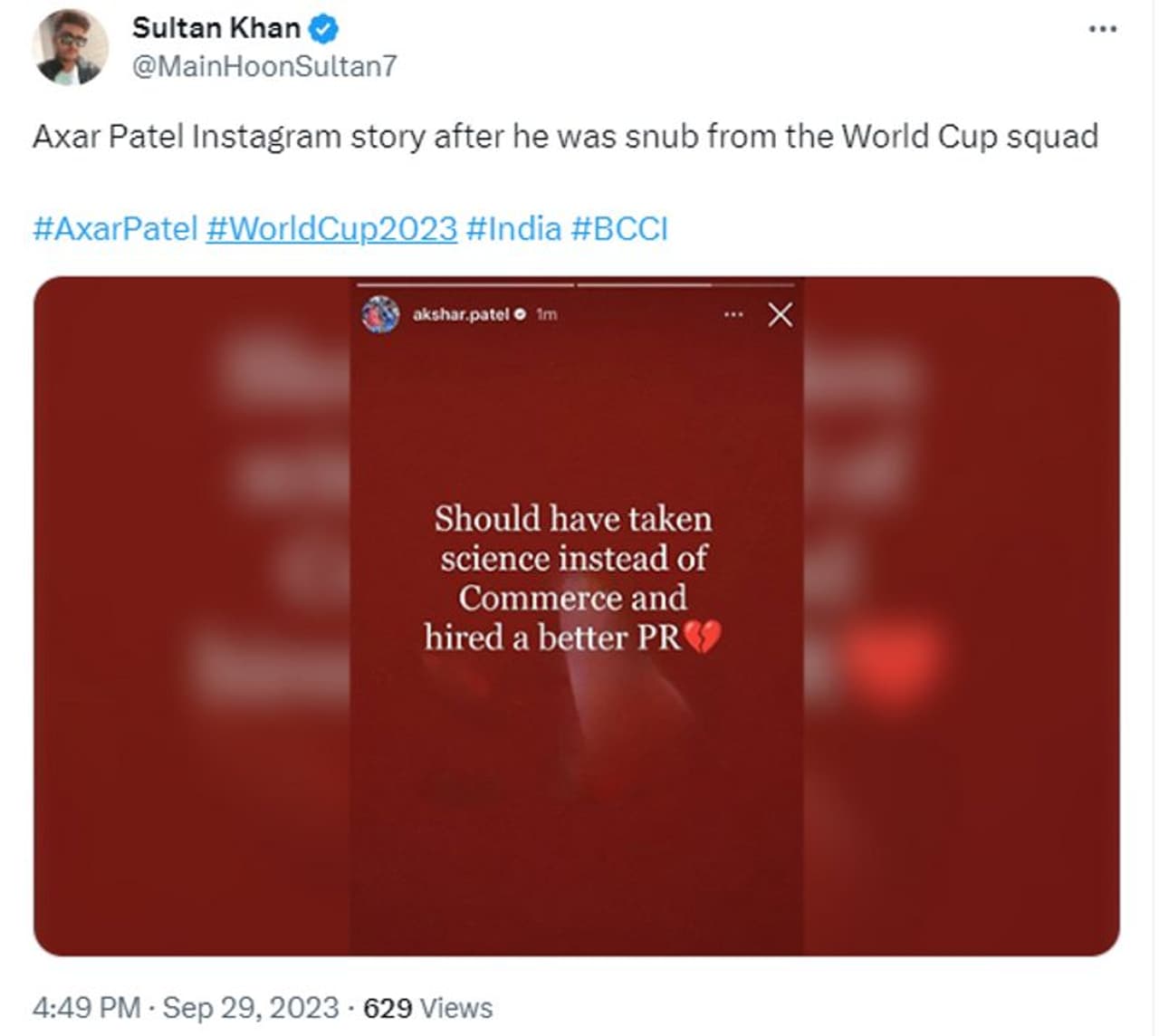എന്നാല് ലോകകപ്പ് ടീം അപ്ഡേഷന് പിന്നാലെ അക്സര് പട്ടേല് ഇങ്ങനെ രണ്ട് ഇന്സ്റ്റഗ്രാം സ്റ്റോറികള് പോസ്റ്റ് ചെയ്തിട്ടില്ല എന്നതാണ് യാഥാര്ഥ്യം. അക്സറിന്റെ ഇന്സ്റ്റഗ്രാമില് നിന്ന് പകര്ത്തിയത് എന്ന പേരില് പ്രചരിക്കുന്ന സ്ക്രീന്ഷോട്ടുകളുടെ വസ്തുത മാധ്യമപ്രവര്ത്തകനായ സൗരഭ് മല്ഹോത്ര ട്വീറ്റ് ചെയ്തത് പരിശോധനയില് കണ്ടെത്താനായി. അക്സര് ഇത്തരം ഇന്സ്റ്റഗ്രാം സ്റ്റോറികള് പോസ്റ്റ് ചെയ്തിരുന്നില്ല എന്നും അതിനാല് തന്നെ അവ ഡിലീറ്റ് ചെയ്തോ എന്ന ചോദ്യത്തിന് പ്രസക്തിയില്ല എന്നും സൗരഭ് ട്വീറ്റില് വിശദീകരിക്കുന്നു. അക്സറിന്റെ പ്രതികരണം എന്ന നിലയ്ക്കാണ് ഞാനീ വിവരം പങ്കുവെക്കുന്നത് എന്നും സൗരഭ് മല്ഹോത്രയുടെ ട്വീറ്റിലുണ്ട്. 2023 സെപ്റ്റംബര് 29ന് സൗരഭിന്റെ ട്വീറ്റ് പ്രത്യക്ഷപ്പെട്ടത്.