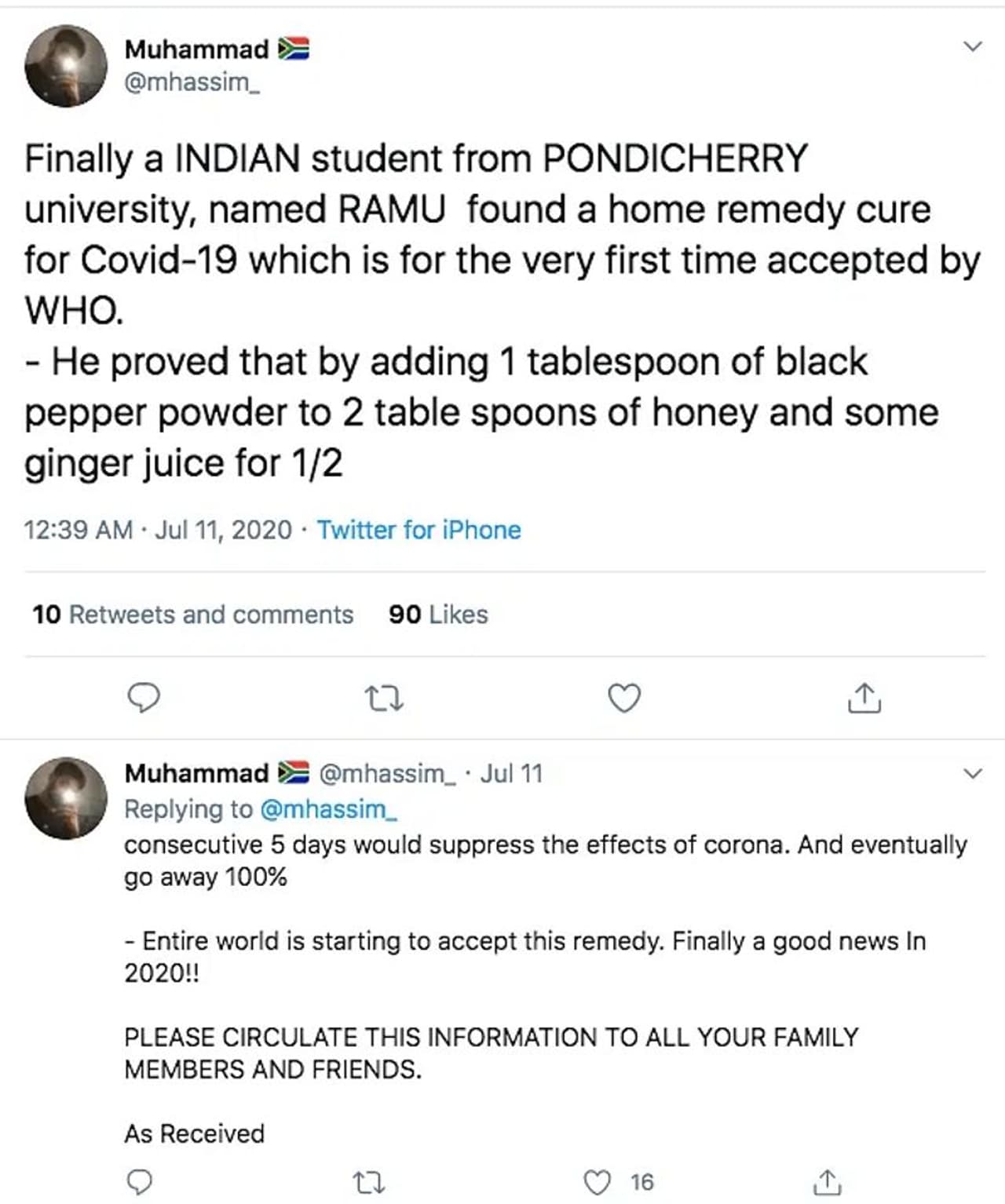 കുരുമുളകും ഇഞ്ചിയും തേനും ചേര്ത്ത് കഴിച്ചാല് കൊവിഡ് മാറുമെന്നതിന് ശാസ്ത്രീയ തെളിവുകളില്ല എന്നതാണ് യാഥാര്ഥ്യം.