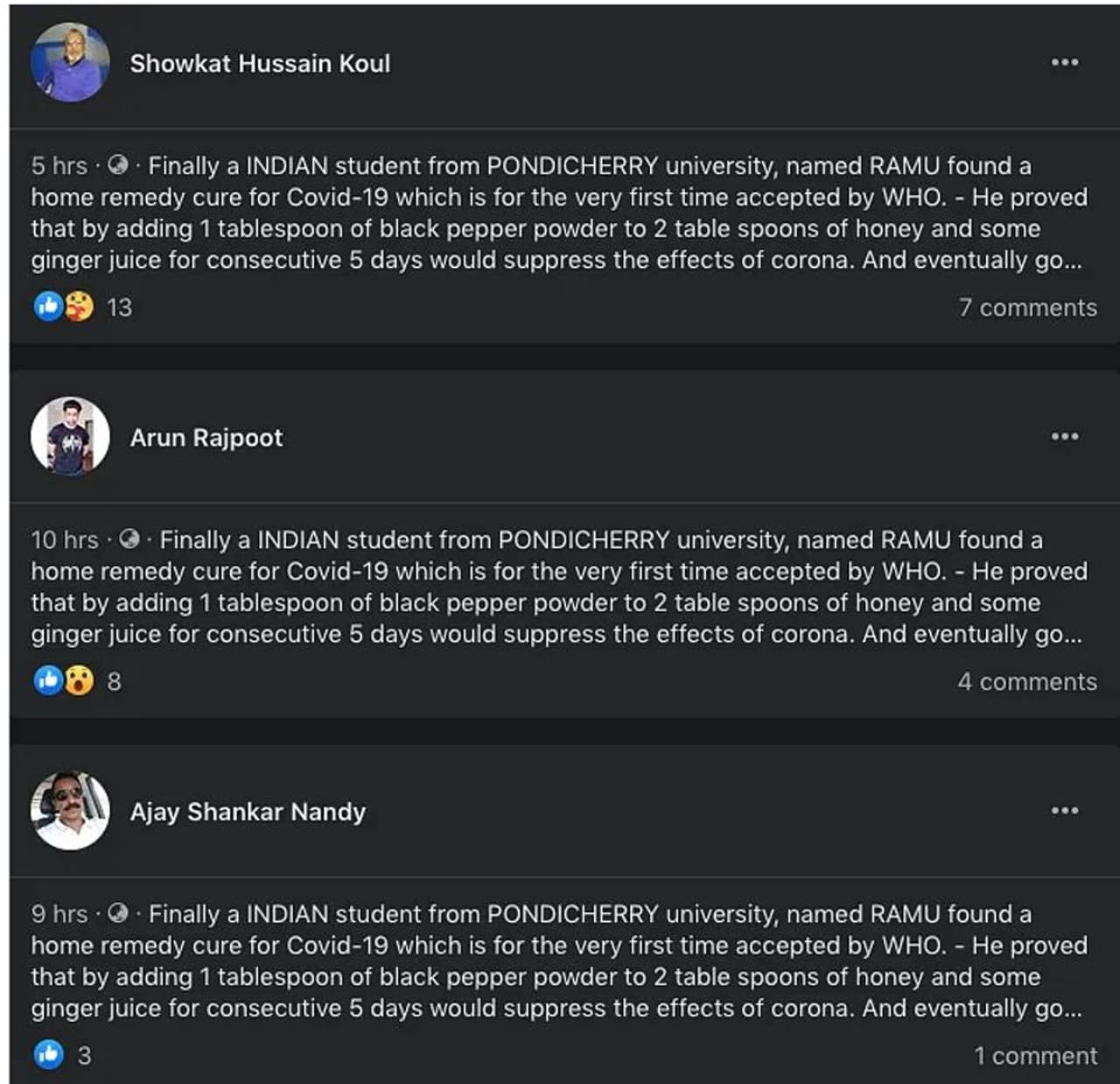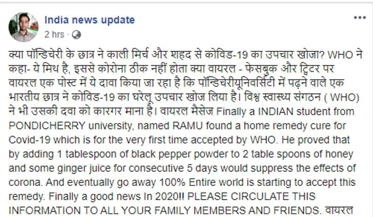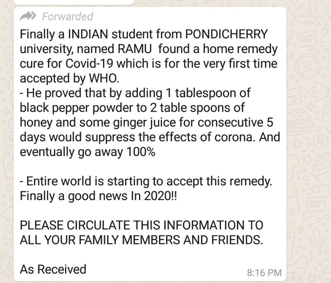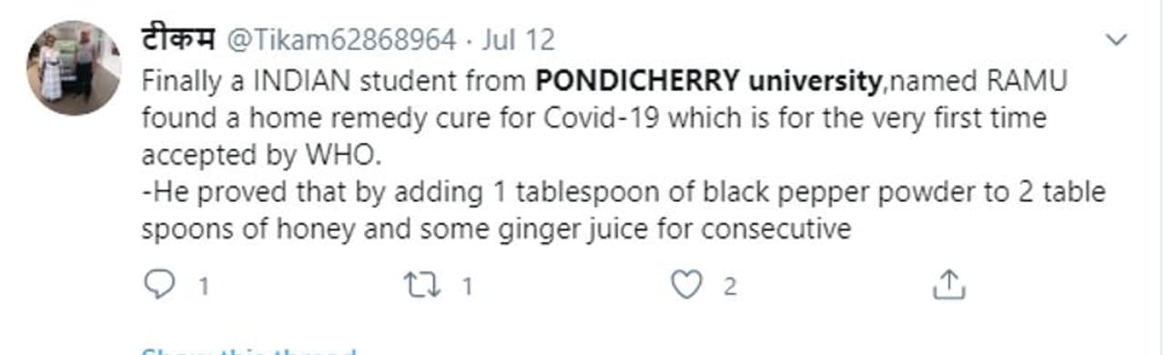 ദില്ലി: 'അല്പം കുരുമുളക്, ഇഞ്ചി, തേന്...ഇവ മൂന്നും കുഴമ്പു രൂപത്തിലാക്കി കഴിച്ചാല് കൊവിഡിന് അത്ഭുത മരുന്നായി'. പോണ്ടിച്ചേരി സര്വകലാശാലയിലെ വിദ്യാര്ത്ഥിയുടെ ഈ കണ്ടെത്തലിന് ലോകാരോഗ്യ സംഘടന(WHO) അനുമതി നല്കി എന്ന് സാമൂഹ്യമാധ്യമങ്ങളില് പ്രചരിക്കുകയാണ്. എന്താണ് ഈ പ്രചാരണങ്ങളിലെ വസ്തുത.
