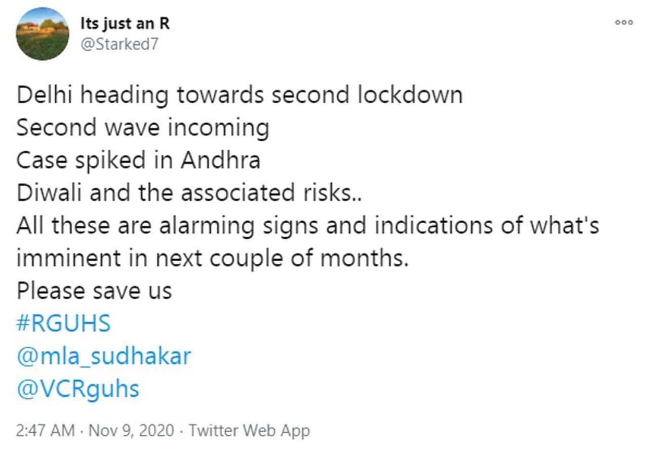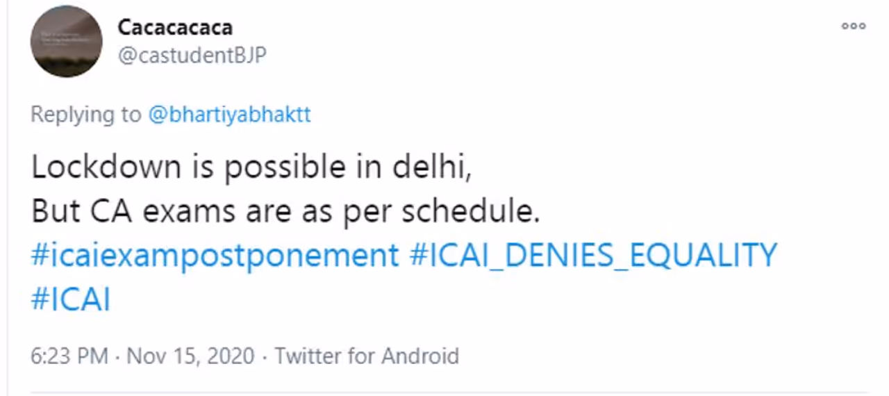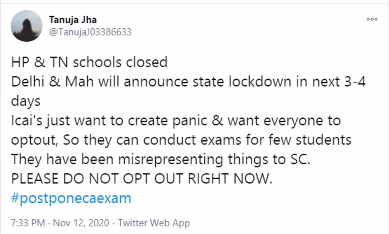 'ദില്ലിയും മഹാരാഷ്ട്രയും മൂന്നുനാല് ദിവസങ്ങള്ക്കുള്ളില് സംസ്ഥാനത്ത് ലോക്ക്ഡൗണ് പ്രഖ്യാപിക്കും. അതിനാല് സിഎ പരീക്ഷകള് മാറ്റിവയ്ക്കുക' എന്നായിരുന്നു നവംബര് 14ന് സാമൂഹ്യമാധ്യമങ്ങളില് പ്രചരിച്ച ഒരു സന്ദേശത്തില് പറയുന്നത്. വീണ്ടും ലോക്ക്ഡൗണ് വന്നേക്കും എന്ന തരത്തില് നിരവധി ട്വീറ്റുകളും സാമൂഹ്യമാധ്യമങ്ങളില് പ്രചരിച്ചു. ദില്ലിയില് സമ്പൂര്ണ ലോക്ക്ഡൗണും പാതി ലോക്ക്ഡൗണും വേണമെന്ന തരത്തില് രണ്ട് ആവശ്യങ്ങളും ശക്തമാണ്.