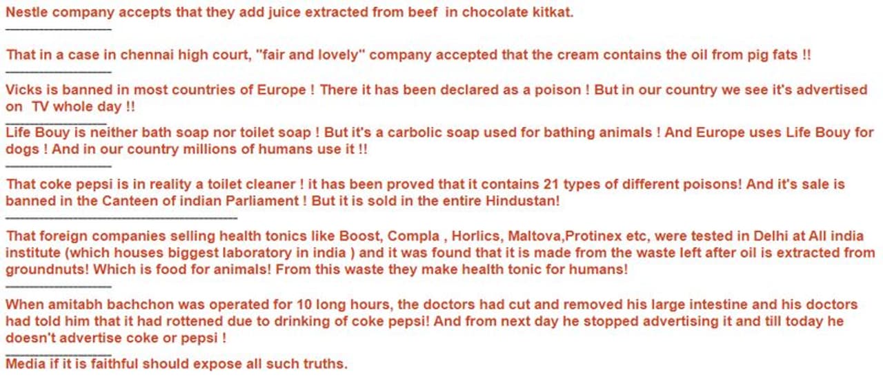വൈറല് സന്ദേശത്തിലുള്ള മറ്റ് ചില ആരോപണങ്ങളുടെ വസ്തുതയും നോക്കാം. കിറ്റ്കാറ്റ് ചോക്ക്ലേറ്റില് മാട്ടിറച്ചിയില് നിന്ന് വേര്തിരിച്ചെടുക്കുന്ന പദാര്ഥങ്ങളുണ്ട് എന്നതായിരുന്നു മറ്റൊരു വ്യാജ പ്രചാരണം. എന്നാല് ഈ വാദവും തെറ്റാണ് എന്ന് ഏഷ്യാനെറ്റ് ന്യൂസ് ഓണ്ലൈന് ഫാക്ട് ചെക്ക് ടീം കണ്ടെത്തി. കിറ്റ്കാറ്റിനെതിരെ ഈ ആരോപണം ഏറെ വര്ഷം മുമ്പുമുണ്ടായിട്ടുണ്ട് എന്ന് കാണാം. അന്നുതന്നെ കമ്പനി ഇക്കാര്യം നിഷേധിച്ചിരുന്നു. ഇന്ത്യയില് വില്ക്കുന്ന കിറ്റ്കാറ്റ് 100 ശതമാനം വെജിറ്റേറിയനാണ് എന്ന് ചോക്ക്ലേറ്റിന്റെ നിര്മാതാക്കളായ നെസ്ലെ ഇന്ത്യ 2015ല് ട്വീറ്റ് ചെയ്തിരുന്നു. കിറ്റ്കാറ്റിലെ ചേരുവകളുടെ പട്ടിക മിഠായിയുടെ പാക്കറ്റില് നല്കിയിട്ടുണ്ട് എന്നും നെസ്ലെയുടെ ട്വീറ്റിലുണ്ട്.