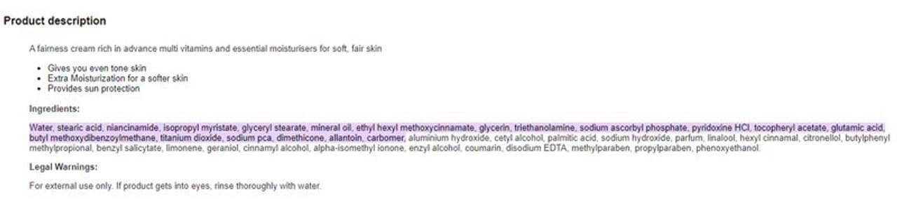 വൈറല് സന്ദേശം ആളുകളെ തെറ്റിദ്ധരിപ്പിക്കുന്നതും പേടിപ്പിക്കാന് വേണ്ടി ആരോ പടച്ചുവിട്ടിരിക്കുന്നതുമാണ് എന്നതാണ് യാഥാര്ഥ്യം. ഫെയര് ആന്ഡ് ലവ്ലി എന്ന ക്രീമിൽ പന്നി നെയ്യ് ചേർത്തിട്ടുണ്ടെന്ന് ചെന്നൈ ഹൈക്കോടതിയിൽ കമ്പനി സമ്മതിച്ചു എന്നതാണ് വൈറല് സന്ദേശത്തിലെ ആദ്യ വാചകം. എന്നാല് ഇതിനെ കുറിച്ച് വിശദമായി പരിശോധിച്ചപ്പോള് മനസിലായത് ഇത് വ്യാജ ആരോപണം മാത്രമാണെന്നാണ്. ഓണ്ലൈന് വില്പന കേന്ദ്രമായ ആമസോണില് നല്കിയിരിക്കുന്ന ഫെയര് ആന്ഡ് ലവ്ലിയിലെ ഉള്ളടക്കം സംബന്ധിച്ച വിവരണത്തില് ഒരിടത്തും പന്നി നെയ്യ് കണ്ടെത്താന് ഏഷ്യാനെറ്റ് ഓണ്ലൈനിന്റെ ഫാക്ട് ചെക്കിലായില്ല. ഫെയര് ആന്ഡ് ലവ്ലിയിലെ ചേരുവകള് എന്തൊക്കെയാണ് എന്ന് വിശദീകരിക്കുന്ന സ്ക്രീന്ഷോട്ട് ചുവടെ വായിക്കാം.