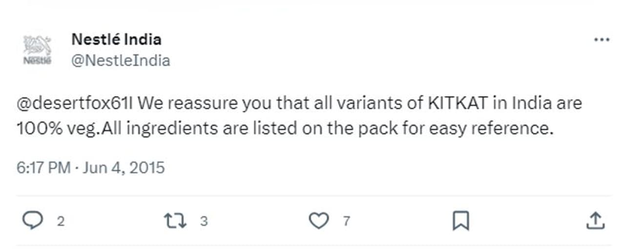 നെസ്ലെയുടെ ട്വീറ്റിന്റെ സ്ക്രീന്ഷോട്ട്