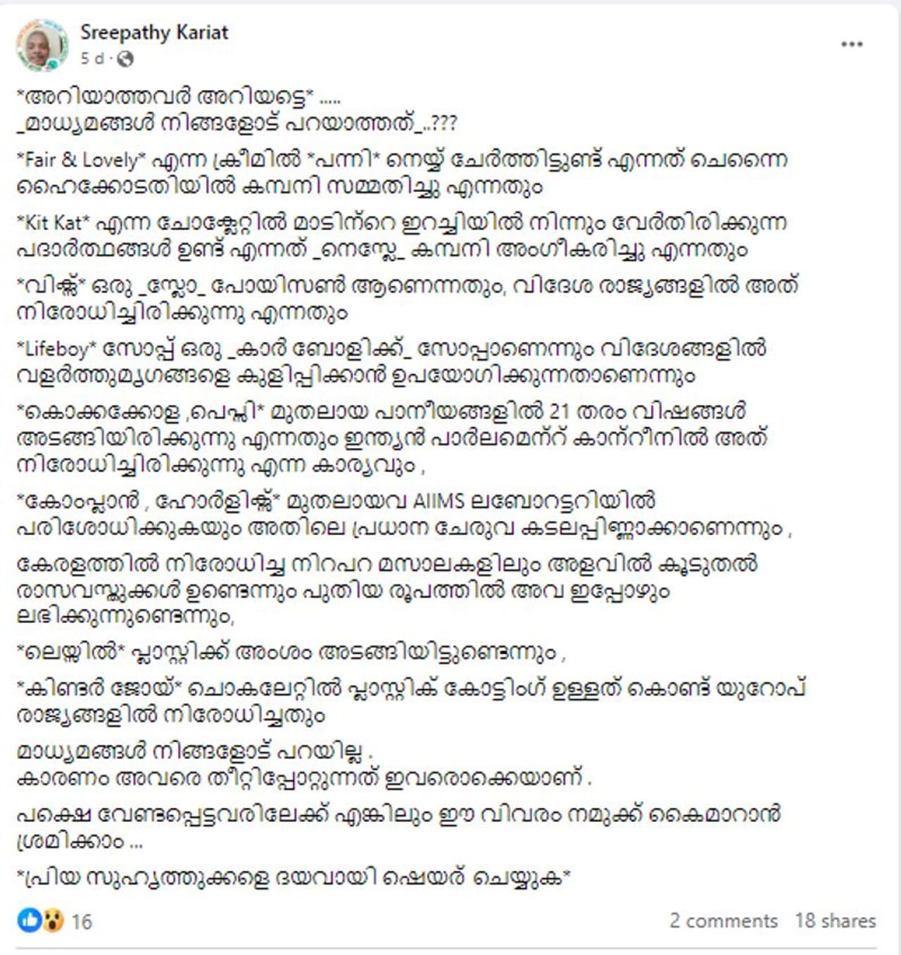 തിരുവനന്തപുരം: 'സൗന്ദര്യ വര്ധക ക്രീമായഫെയര് ആന്ഡ് ലവ്ലിയില് (ഇപ്പോള് ഗ്ലോ ആന്ഡ് ലവ്ലി) പന്നി നെയ്യ് ചേർത്തിട്ടുണ്ട്, കിറ്റ്കാറ്റ് ചോക്ക്ലേറ്റില് മാടിന്റെ ഇറച്ചിയിൽ നിന്നും വേർതിരിക്കുന്ന പദാർത്ഥങ്ങൾ ഉണ്ട്, ലെയ്സിൽ പ്ലാസ്റ്റിക്ക് അംശം അടങ്ങിയിട്ടുണ്ട്, വിക്സ് ഒരു സ്ലോപോയിസൺ ആണ്' എന്നിങ്ങനെ നീളുന്ന വലിയൊരു സന്ദേശം വാട്സ്ആപ്പില് പലര്ക്കും കിട്ടിക്കാണും. 'അറിയാത്തവർ അറിയട്ടെ... ഇതൊന്നും മാധ്യമങ്ങൾ നിങ്ങളോട് പറയില്ല. കാരണം, അവരെ തീറ്റിപ്പോറ്റുന്നത് ഇവരൊക്കെയാണ്. പക്ഷേ വേണ്ടപ്പെട്ടവരിലേക്ക് എങ്കിലും ഈ വിവരം നമുക്ക് കൈമാറാൻ ശ്രമിക്കാം'... എന്നിങ്ങനെ നീളുന്നു വൈറല് സന്ദേശത്തിലെ ഭീതിപ്പെടുത്തുന്ന വാക്കുകള്. നാം ഉപയോഗിക്കുന്ന ഈ സാധനങ്ങള് എല്ലാം ഇത്ര അപകടകാരികളായിരുന്നോ? വൈറല് സന്ദേശം സത്യമോ എന്ന് പരിശോധിക്കാം.