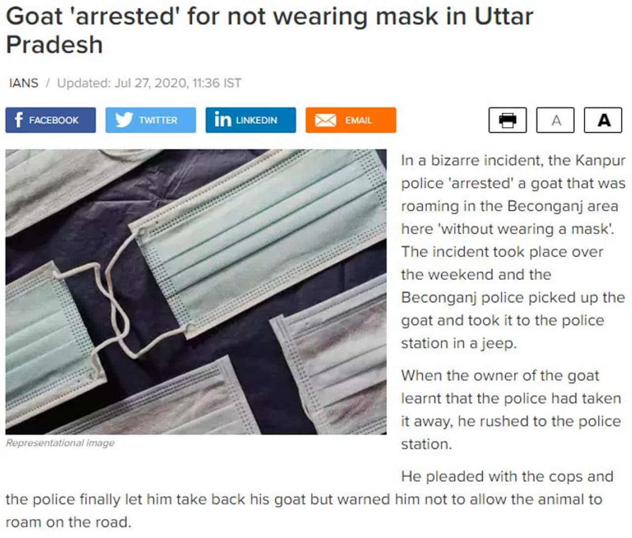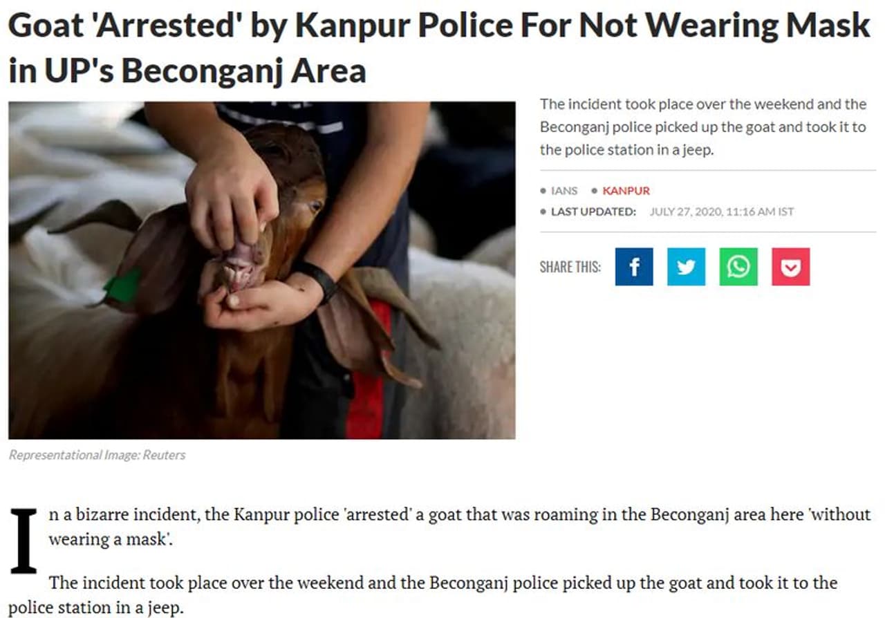 മാസ്ക് ധരിക്കാത്തതിന് ആടിനെ അറസ്റ്റ് ചെയ്തു എന്ന് ആദ്യം റിപ്പോര്ട്ട് ചെയ്തത് വാര്ത്താ ഏജന്സിയായ ഐഎഎന്എസ് ആണ്. ഇതിനുപിന്നാലെ ദേശീയ മാധ്യമമായ ന്യൂസ് 18 ഉള്പ്പടെയുള്ളവര് ഐഎഎന്എസിനെ ഉദ്ധരിച്ച് വാര്ത്ത നല്കി.