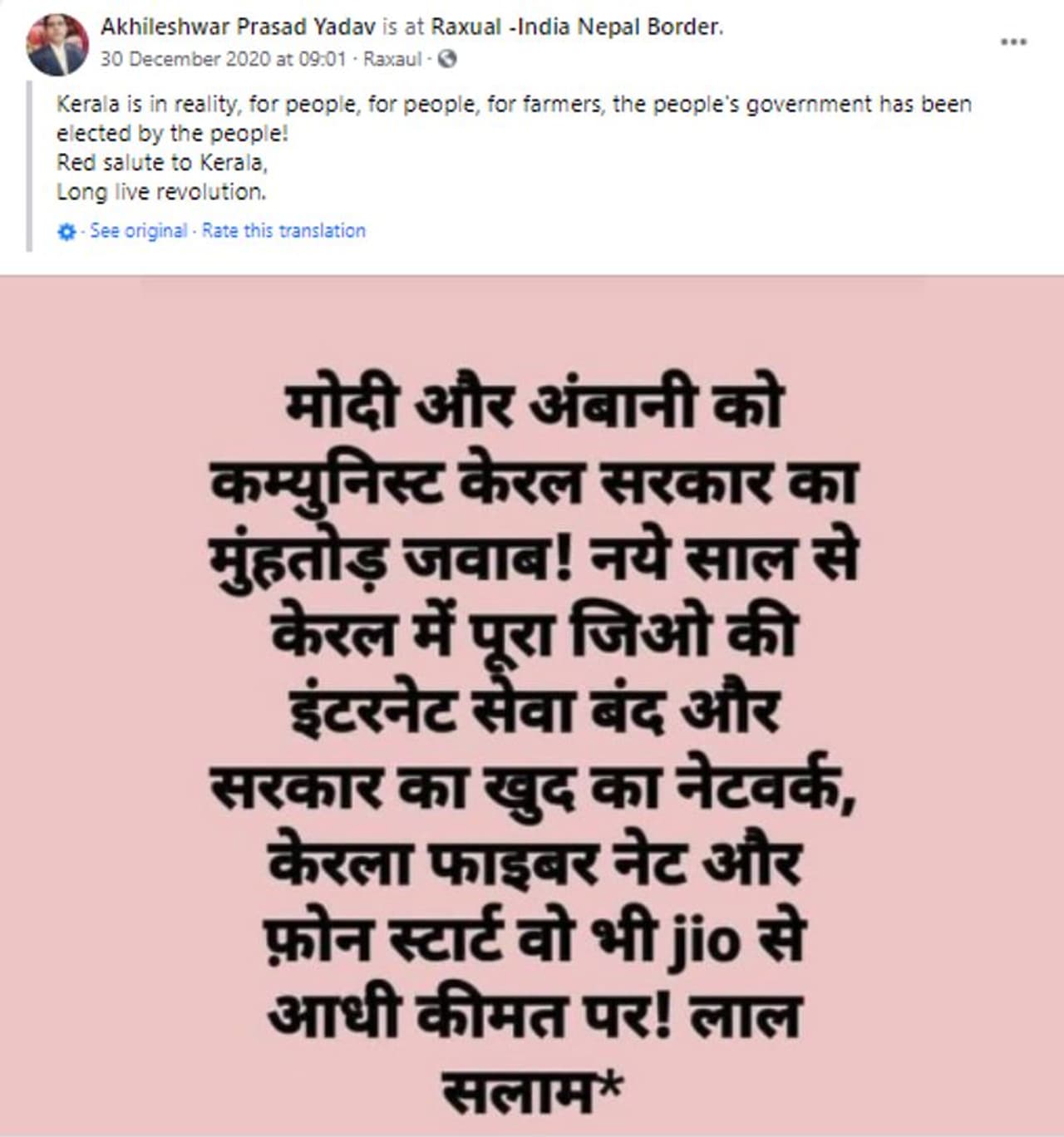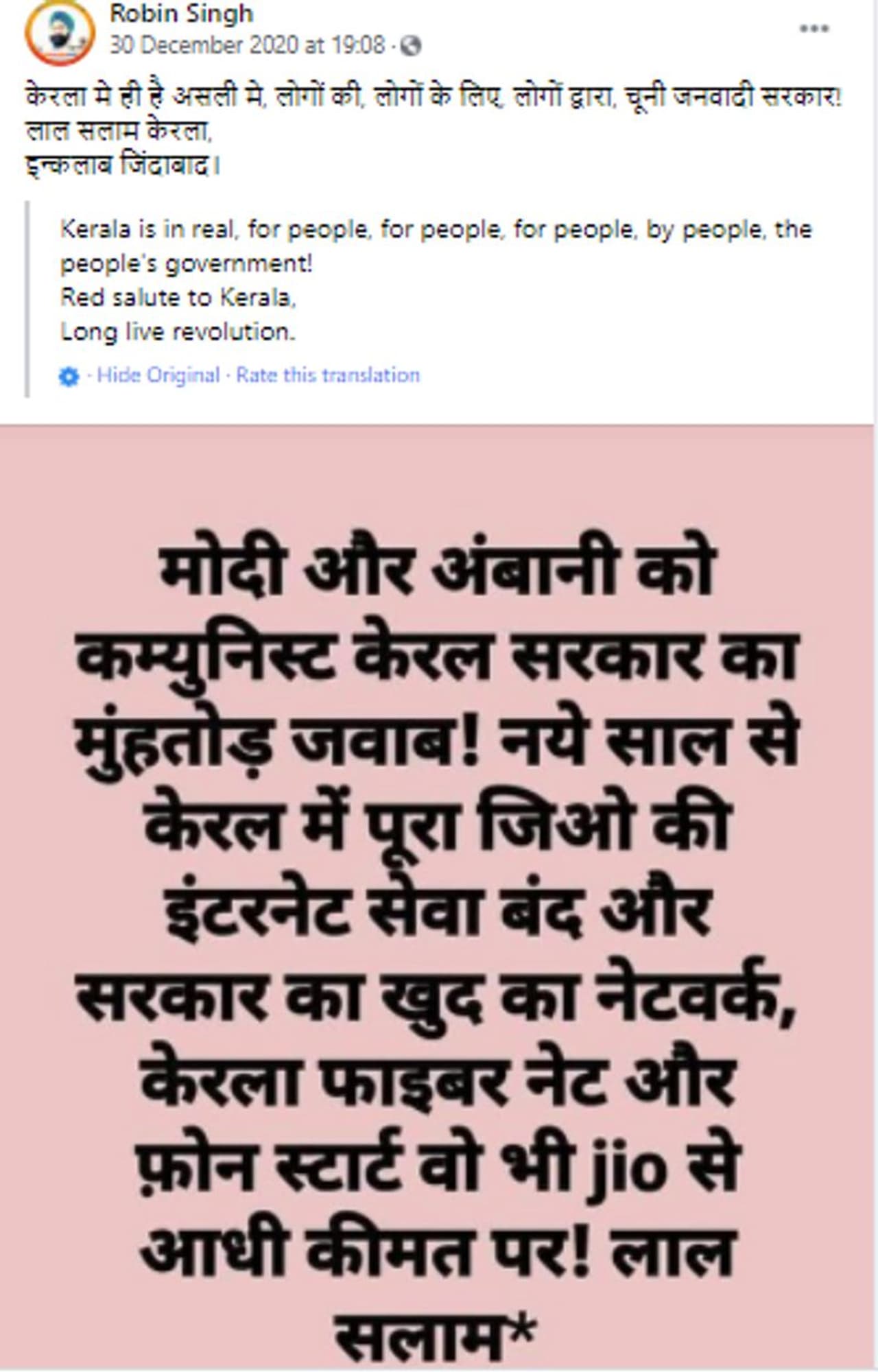 'മോദിക്കും അംബാനിക്കും കേരളത്തിലെ കമ്മ്യൂണിസ്റ്റ് സര്ക്കാരിന്റെ ചുട്ട മറുപടി. പുതു വര്ഷം മുതല് ജിയോ സേവനങ്ങള്ക്ക് താഴിടുകയാണ് കേരളം. ജിയോയുടെ പകുതി നിരക്കില് സര്ക്കാരിന്റെ സ്വന്തം നെറ്റ്വര്ക്കായ കേരള ഫൈബര് നെറ്റും മൊബൈല് സേവനവും ജനങ്ങള്ക്ക് ലഭ്യമാകും' എന്നാണ് ഹിന്ദിയില് പ്രചരിക്കുന്ന സന്ദേശങ്ങള് പറയുന്നത്.
