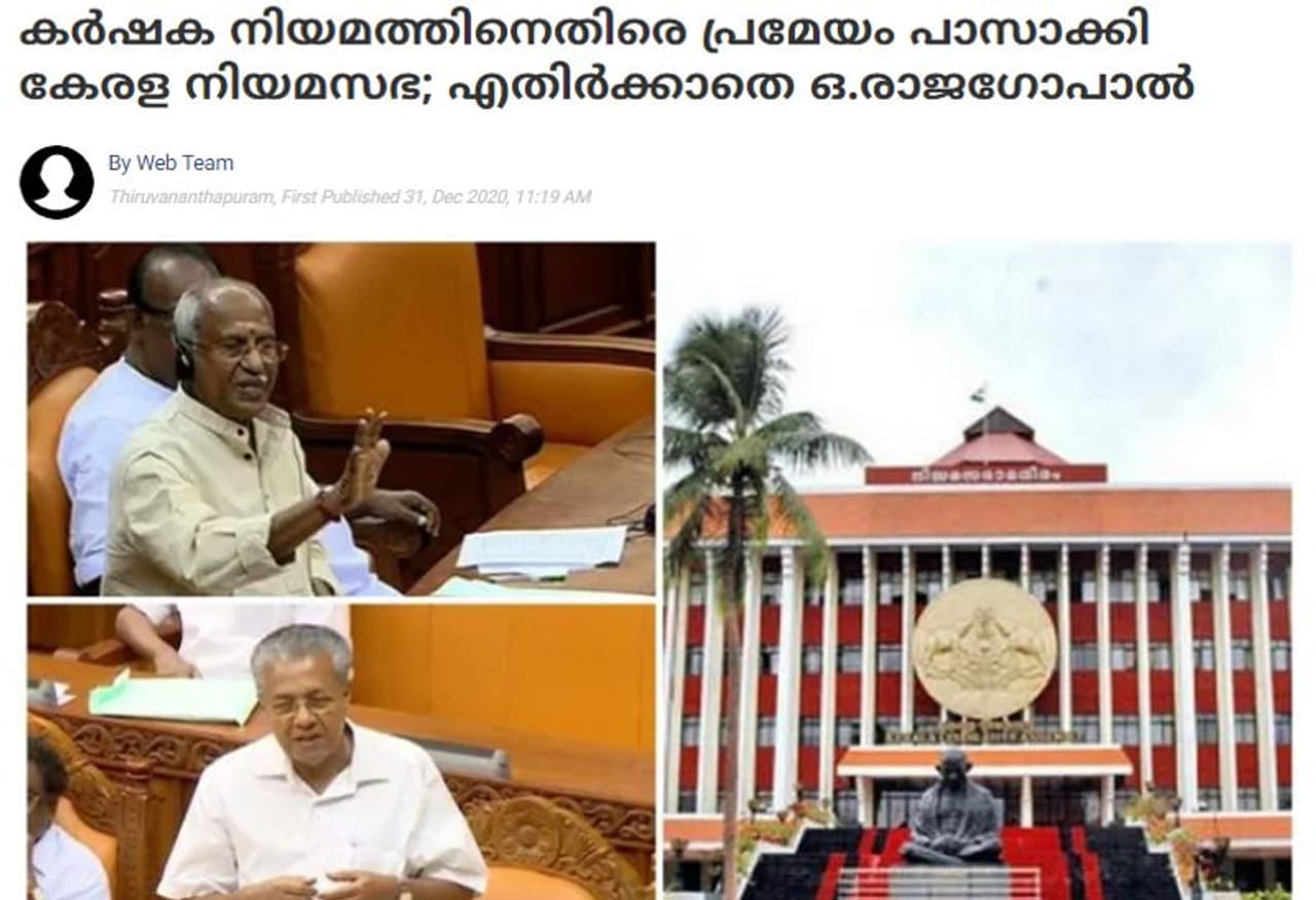 കേന്ദ്ര സര്ക്കാരിന്റെ കാര്ഷിക നിയമ ഭേദഗതിക്കെതിരെയുള്ള പ്രമേയം 2020 ഡിസംബര് 31നാണ് കേരള നിയമസഭ പാസാക്കിയത്. കേന്ദ്രത്തിന്റെ കാര്ഷിക നിയമഭേദഗതി റദ്ദാക്കണം എന്നാണ് പ്രമേയത്തില് കേരളം ആവശ്യപ്പെട്ടത്. പ്രമേയം പാസാക്കുന്നതിനെ ബിജെപി അംഗം ഒ. രാജഗോപാല് എതിര്ത്തെങ്കിലും അദേഹം വോട്ടെടുപ്പ് ആവശ്യപ്പെട്ടില്ല. ഇതോടെ പ്രമേയം ഐക്യകണ്ഠേന പാസാവുകയായിരുന്നു. നിയമസഭയിലെ പ്രമേയ അവതരണവും പിന്നാലെ നടന്ന ചര്ച്ചയും വിശദമായി ചുവടെയുള്ള ലിങ്കില് വായിക്കാം.