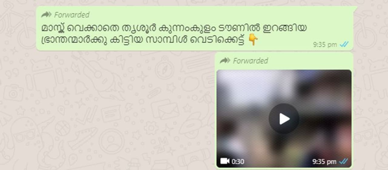 'മാസ്ക് വെക്കാതെ തൃശൂര് കുന്നംകുളം ടൗണില് ഇറങ്ങിയ ഭ്രാന്തന്മാര്ക്ക് കിട്ടിയ സാമ്പില് വെടിക്കെട്ട്' എന്ന കുറിപ്പോടെയാണ് വീഡിയോ പ്രചരിക്കുന്നത്. 30 സെക്കന്റാണ് വീഡിയോയുടെ ദൈര്ഘ്യം. ആളുകളെ പൊലീസുകാര് ലാത്തിച്ചാര്ജ് നടത്തുന്നത് ദൃശ്യത്തില് വ്യക്തം. പൊലീസുകാര് ഉള്പ്പടെ വീഡിയോയിലുള്ള പലരും മാസ്ക് ധരിച്ചിട്ടുള്ളതിനാല് ഈ ദൃശ്യം കൊവിഡ് കാലത്തെയെന്ന് ഉറപ്പിക്കാം. എന്നാല് ഈ വീഡിയോ ആരാണ് പകര്ത്തിയത് എന്ന് വ്യക്തമല്ല. വാട്സ്ആപ്പില് പ്രചരിക്കുന്ന ദൃശ്യം ചുവടെ.