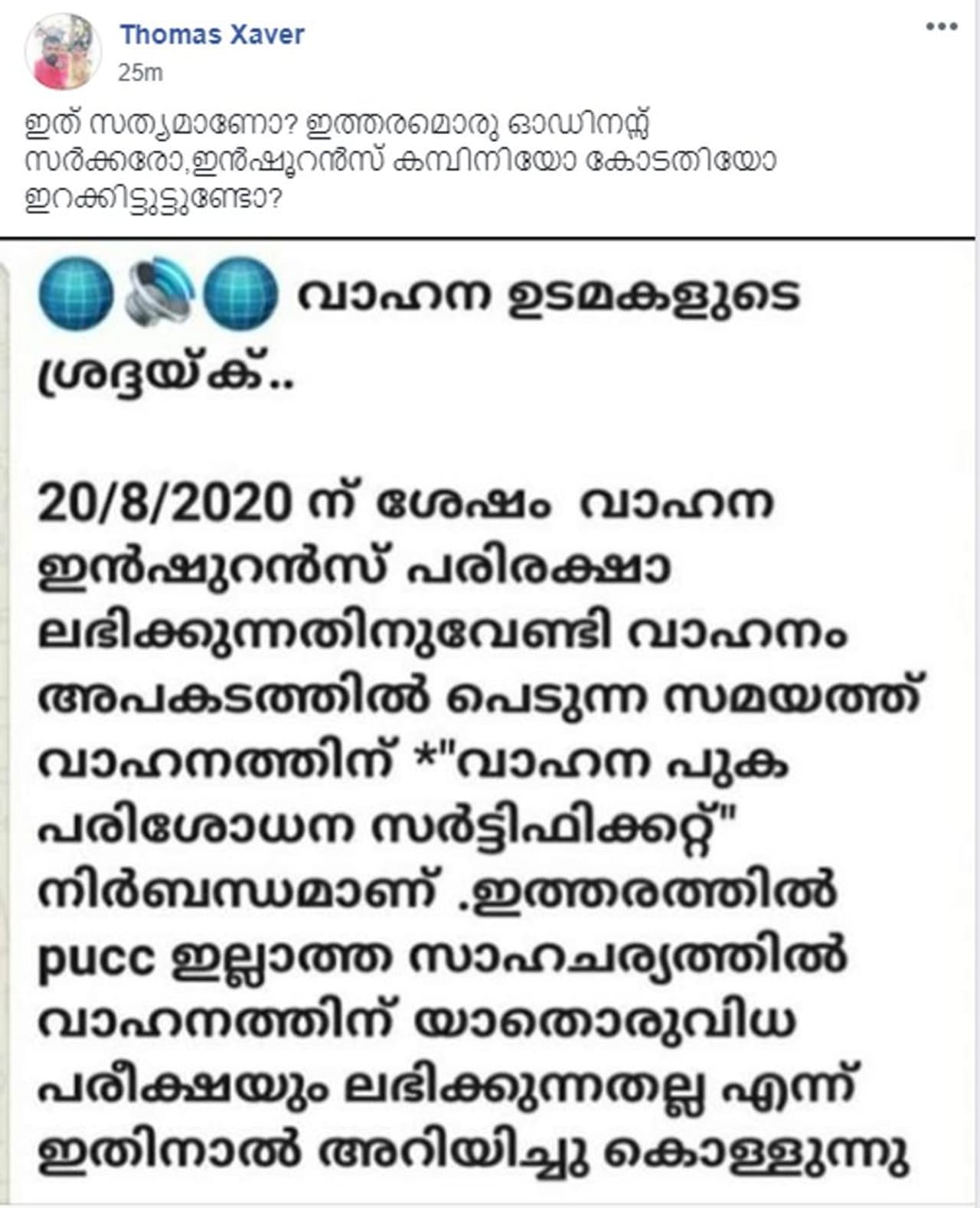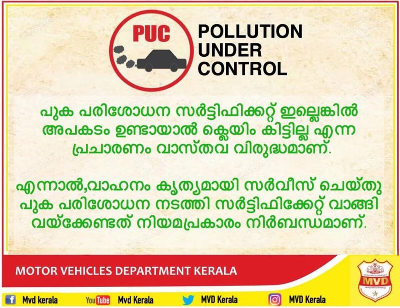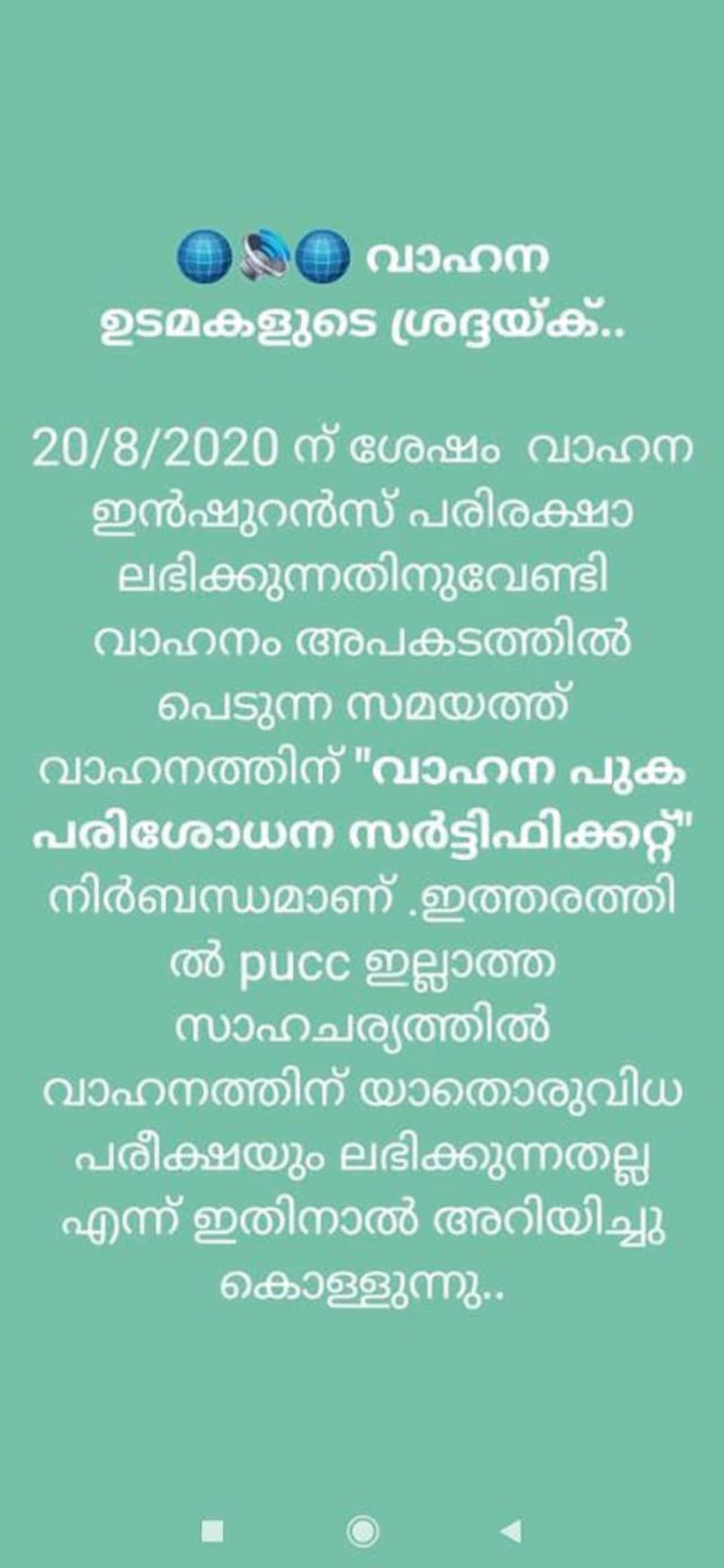 20/08/2020ന് ശേഷം വാഹന ഇന്ഷുറന്സ് പരിരക്ഷ ലഭിക്കുന്നതിനുവേണ്ടി വാഹനം അപകടത്തില്പ്പെടുന്ന സമയത്ത് വാഹനത്തിന് "വാഹന പുക പരിശോധന സര്ട്ടിഫിക്കറ്റ്" നിര്ബന്ധമാണ്. ഇത്തരത്തില് pucc ഇല്ലാത്ത സാഹചര്യത്തില് വാഹനത്തിന് യാതൊരുവിധ പരിരക്ഷയും ലഭിക്കുന്നതല്ല എന്ന് ഇതിനാല് അറിയിച്ചുകൊള്ളുന്നു'.