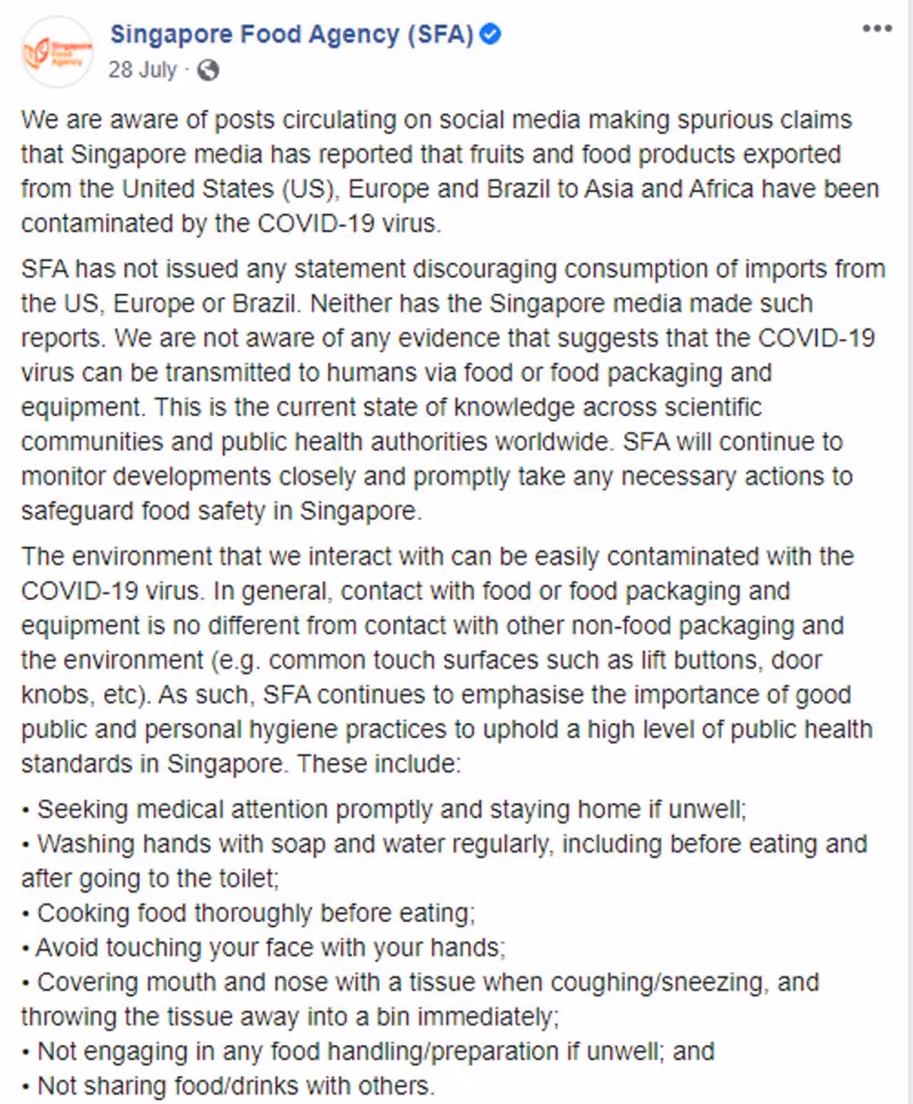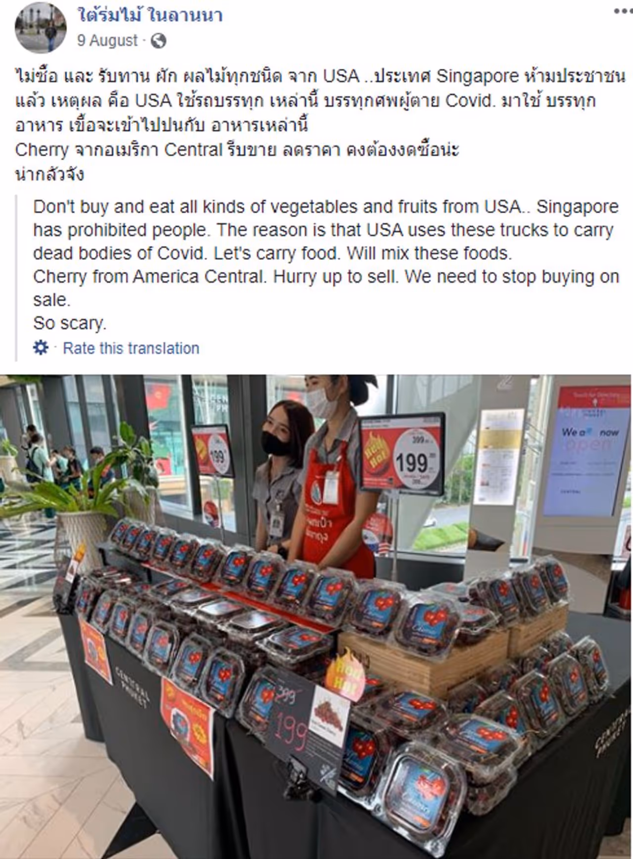 'അമേരിക്കയില് നിന്ന് ഇറക്കുമതി ചെയ്യുന്ന പഴങ്ങളും പച്ചക്കറികളും ആരും വാങ്ങുകയോ കഴിക്കുകയോ ചെയ്യരുത്. അവ ഉപയോഗിക്കുന്നത് സിംഗപ്പൂര് നിരോധിച്ചിരിക്കുകയാണ്. കൊവിഡ് ബാധിച്ച് മരിച്ചവരുടെ മൃതദേഹങ്ങള് കൊണ്ടുപോകുന്ന അതേ ട്രക്കുകളിലാണ് ഭക്ഷണപദാര്ഥങ്ങളും കയറ്റുന്നത്. ഇത് വൈറസ് വ്യാപനത്തിന് കാരണമാകുന്നു'. ഓഗസ്റ്റ് 10 മുതല് സാമൂഹ്യമാധ്യമങ്ങളില് പ്രചരിക്കുന്ന സന്ദേശം ഇതാണ്. യൂറോപ്പ്, ബ്രസീല്, ഏഷ്യ, ആഫ്രിക്ക എന്നിവിടങ്ങളില് നിന്നുള്ള ഭക്ഷ്യ ഉല്പന്നങ്ങള്ക്കും നിരോധനമുണ്ട് എന്നും പ്രചാരണമുണ്ട്.