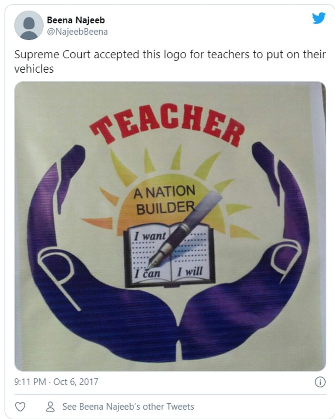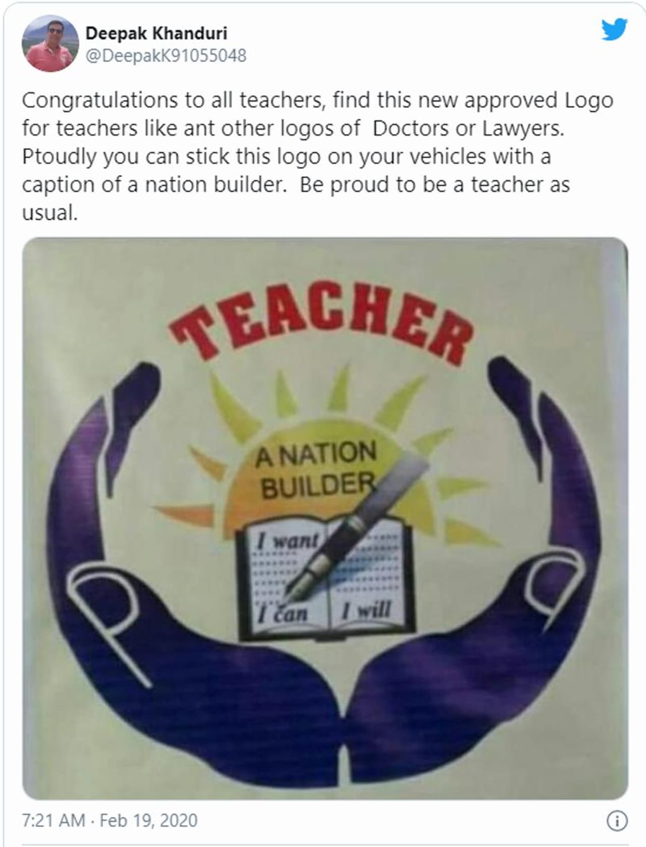 ആദ്യ കാഴ്ചയില് തന്നെ അധ്യാപകരെ പ്രതിനിധാനം ചെയ്യുന്നതാണ് ലോഗോ. രണ്ട് കൈപ്പത്തികളുടെ നടുവിലായി പേനയും പുസ്തകവും ഉള്ക്കൊള്ളുന്ന ലോഗോ. I want, I can, I will എന്നീ എഴുത്തുകളും ലോഗോയിലുണ്ട്. ഇത് വാഹനങ്ങളില് ഉപയോഗിക്കാന് സുപ്രീം കോടതി അനുമതി നല്കി എന്നാണ് സാമൂഹ്യമാധ്യമങ്ങളിലെ പ്രചാരണം.