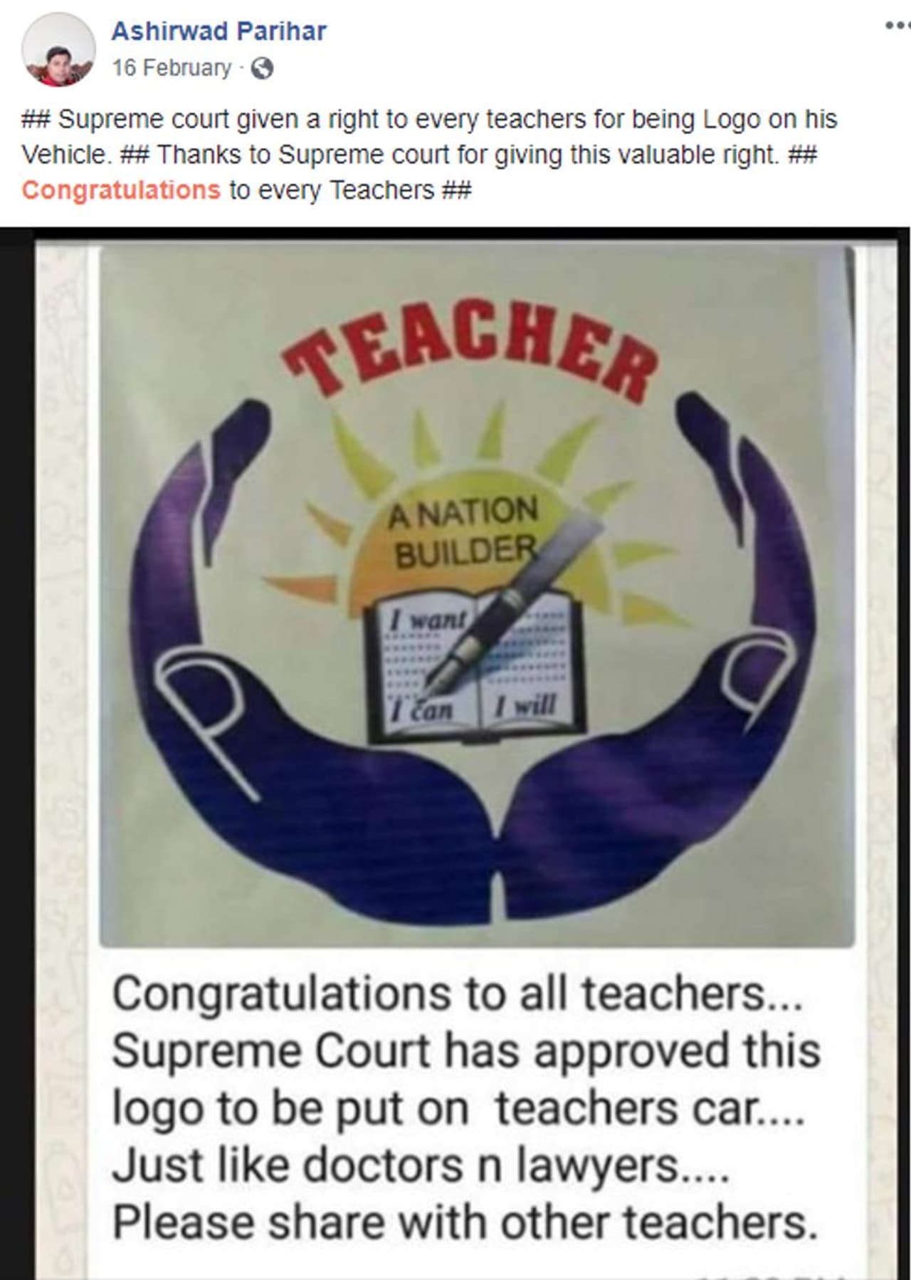 അധ്യാപകര്ക്ക് വാഹനങ്ങളില് പതിപ്പിക്കാനുള്ള ലോഗോയ്ക്ക് സുപ്രീം കോടതി അനുമതി നല്കി എന്ന പ്രചാരണം വ്യാജമാണ്. വൈറലായിരിക്കുന്ന ലോഗോ മൂന്ന് വര്ഷത്തോളമായി സാമൂഹ്യമാധ്യമങ്ങളില് പ്രചരിക്കുന്നതാണ്.