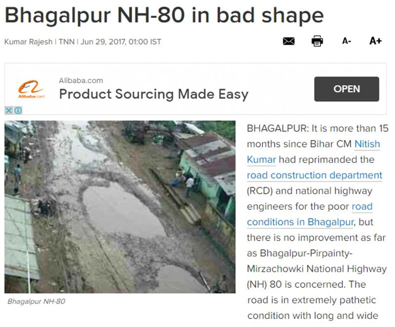 റിവേഴ്സ് ഇമേജ് സെര്ച്ചിലൂടെയാണ് ചിത്രത്തിന് പിന്നിലെ സത്യാവസ്ഥ കണ്ടെത്തിയത്. ഇപ്പോള് പ്രചരിക്കുന്ന ചിത്രം 2017 ജൂണ് 29ന് ദേശീയ മാധ്യമമായ ടൈംസ് ഓഫ് ഇന്ത്യ നല്കിയ ഒരു വാര്ത്തയില് നിന്നുള്ളതാണ് എന്ന് റിവേഴ്സ് ഇമേജ് സെര്ച്ചില് കണ്ടെത്താനായി. ഭാഗല്പുരിലൂടെ കടന്നുപോകുന്ന 'എന്എച്ച് 90' റോഡിന്റെ ശോചനീയാവസ്ഥയെ കുറിച്ചാണ് ടൈംസ് ഓഫ് ഇന്ത്യയുടെ വാര്ത്ത.