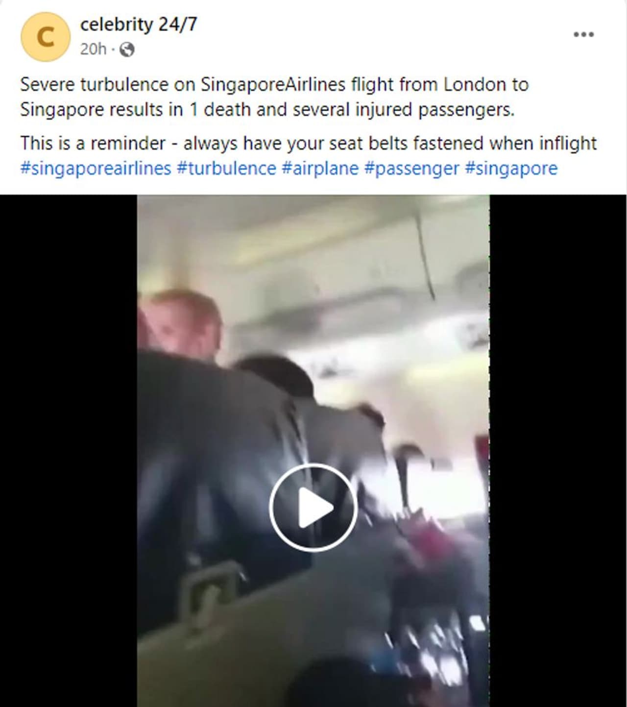 'ലണ്ടനില് നിന്ന് സിംഗപ്പൂരിലേക്കുള്ള യാത്രക്കിടെ സിംഗപ്പൂര് എയര്ലൈന്സിന്റെ വിമാനം ആകാശച്ചുഴിയില്പ്പെട്ടതിനെ തുടര്ന്ന് ഒരാള് മരിക്കുകയും നിരവധി പേര്ക്ക് പരിക്കേല്ക്കുകയും ചെയ്തു. ഇതൊരു ഓര്മ്മപ്പെടുത്തലാണ്- വിമാനത്തില് യാത്ര ചെയ്യുമ്പോള് എപ്പോഴും സീറ്റ് ബെല്റ്റ് ധരിക്കുക...' എന്നുമുള്ള കുറിപ്പോടെയാണ് വീഡിയോ celebrity 24/7 എന്ന ഫേസ്ബുക്ക് പേജില് വീഡിയോ പോസ്റ്റ് ചെയ്തിരിക്കുന്നത്. സിംഗപ്പൂര് എയര്ലൈന്സുമായി ബന്ധപ്പെട്ട ഹാഷ്ടാഗുകളും വീഡിയോയ്ക്കൊപ്പം കാണാം. വിമാനത്തിനുള്ളില് യാത്രക്കാര് പരിഭ്രാന്തരായ നിലയിലാണ് വീഡിയോയുള്ളത്.