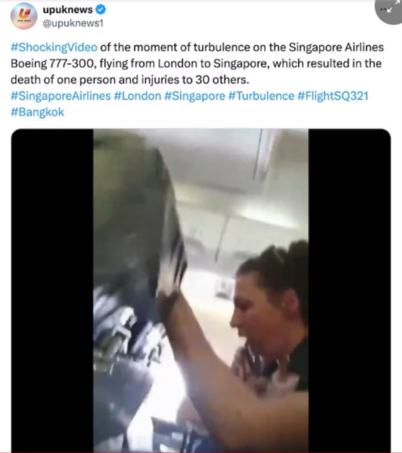 സിംഗപ്പൂർ എയർലൈൻസിന്റെ വിമാനം ഇന്നലെ ആകാശച്ചുഴിയിൽ അകപ്പെട്ടതിനെ തുടര്ന്ന് ഒരാൾക്ക് ജീവൻ നഷ്ടമാവുകയും നിരവധിയാളുകള്ക്ക് പരിക്കേൽക്കുകയും ചെയ്തിരുന്നു. ലണ്ടനിൽ നിന്ന് സിംഗപ്പൂരിലേക്ക് പറക്കവെയാണ് വിമാനം ആകാശച്ചുഴിയില് വീണത്. 229 യാത്രക്കാരുമായി പറക്കുകയായിരുന്ന വിമാനം ഏകദേശം അഞ്ച് മിനിറ്റ് കൊണ്ട് 6000 അടി താഴ്ചയിലേക്ക് എത്തുകയായിരുന്നു. തുടര്ന്ന് വിമാനം അടിയന്തിരമായി ബാങ്കോക്കില് ഇറക്കി. സിംഗപ്പൂർ എയർലൈൻസ് വിമാനം ആകാശച്ചുഴിയില് വീണതിന്റെ എന്ന പേരില് ഒരു വീഡിയോ സോഷ്യല് മീഡിയയില് പ്രചരിക്കുന്നുണ്ട്. ഇത് യഥാര്ഥമോ എന്ന് നോക്കാം.