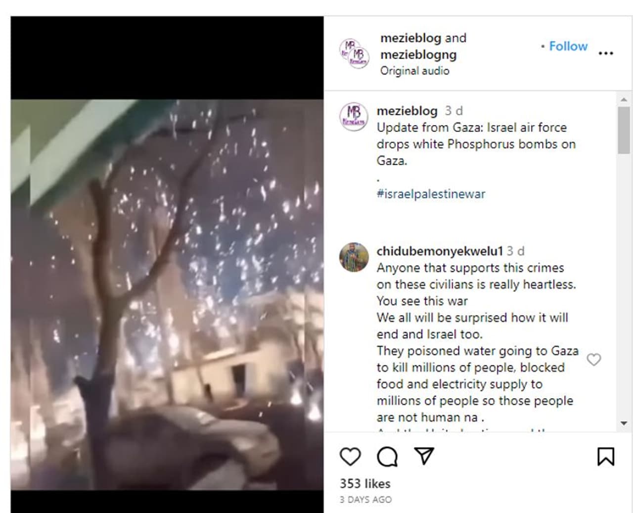 'ഗാസയില് നിന്നുള്ള അപ്ഡേറ്റ്: ഇസ്രയേല് വ്യോമസേന ഗാസയില് വൈറ്റ് ഫേസ്ഫറസ് ബോംബ് വര്ഷിച്ചു' എന്ന തലക്കെട്ടോടെ 2023 ഒക്ടോബര് 11-ാം തിയതിയാണ് വീഡിയോ ഇന്സ്റ്റഗ്രാമില് പ്രത്യക്ഷപ്പെട്ടത്. ആകാശത്ത് നിന്ന് തുടര്ച്ചയായി തീപ്പൊരികള് ഭൂമിയിലേക്ക് പതിക്കുന്നത് ഈ ദൃശ്യങ്ങളില് കാണാം. മൊബൈല് ഫോണ് പോലുള്ള ഉപകരണത്തില് പകര്ത്തിയ ദൃശ്യമാണിത് എന്നാണ് ഒറ്റനോട്ടത്തില് വ്യക്തമാകുന്നത്.