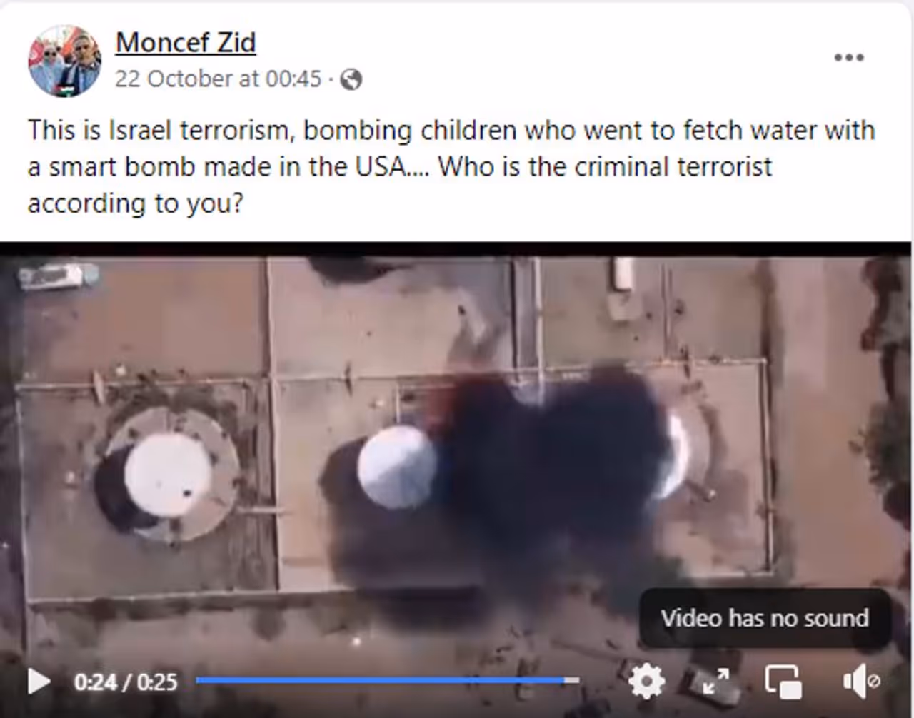 'വെള്ളംകുടിക്കാനെത്തിയ പലസ്തീന് കുട്ടികള്ക്ക് നേരെ ഇസ്രയേല് സൈന്യം ബോംബിട്ടു. ഇസ്രയേലാണ് ലോകത്തെ ഏറ്റവും മോശം രാജ്യം. ഇസ്രയേലിനൊപ്പം നില്ക്കുന്ന രാജ്യങ്ങള് തീവ്രവാദത്തിനൊപ്പം നില്ക്കുന്നതില് ലജ്ജിക്കണം' എന്നുമാണ് ഫേസ്ബുക്ക് പോസ്റ്റിലുള്ളത്. 2023 ഒക്ടോബര് 22-ാം തിയതിയാണ് പോസ്റ്റ് പ്രത്യക്ഷപ്പെട്ടിരിക്കുന്നത്. സമാന വീഡിയോ എക്സിലും (പഴയ ട്വിറ്റര്) ഇതേ അവകാശവാദത്തോടെ പ്രചരിക്കുന്നുണ്ട്.