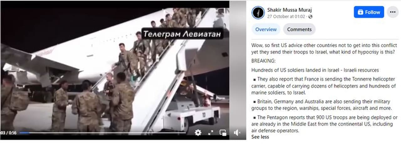 ഇസ്രയേല്-ഹമാസ് സംഘര്ഷത്തില് മറ്റ് രാജ്യങ്ങളോട് ഇടപെടരുത് എന്നാവശ്യപ്പെടുന്ന അമേരിക്ക തങ്ങളുടെ സൈന്യത്തെ ഇസ്രയേലിലേക്ക് അയച്ചിരിക്കുകയാണ് എന്ന് മറ്റൊരു ഫേസ്ബുക്ക് പോസ്റ്റില് പറയുന്നു. നൂറുകണക്കിന് അമേരിക്കന് പട്ടാളക്കാര് എത്തിയതായി ഇസ്രയേല് വൃത്തങ്ങള് സ്ഥിരീകരിച്ചു എന്നും ഫേസ്ബുക്ക് പോസ്റ്റിലുണ്ട്.