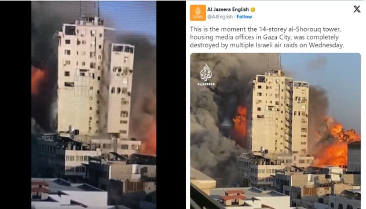 ബഹുനില കെട്ടിടം തകർക്കുന്നതിന്റെ ദൃശ്യങ്ങള് ഇപ്പോഴത്തെ സംഘർഷത്തില് നിന്നുള്ളതല്ല എന്നതാണ് യാഥാർഥ്യം. 2021ല് ഗാസയില് ഇസ്രയേല് നടത്തിയ വ്യോമാക്രമണത്തില് കെട്ടിടം തകരുന്നതിന്റെ വീഡിയോയാണ് ഇപ്പോഴത്തെ സംഘർഷത്തിന്റെ എന്ന അവകാശവാദത്തോടെ പ്രചരിക്കുന്നത്. പ്രചരിക്കുന്ന വീഡിയോയുടെ ഫ്രെയിമുകള് റിവേഴ്സ് ഇമേജ് സെർച്ചിന് വിധേയമാക്കിയതിലൂടെയാണ് ഇക്കാര്യം ബോധ്യപ്പെട്ടത്. ഇപ്പോള് പ്രചരിക്കുന്ന വീഡിയോ 2021 മെയ് മാസം 13-ാം തിയതി രാജ്യാന്തര മാധ്യമമായ അല് ജസീറ ടിവി ട്വീറ്റ് ചെയ്തിട്ടുള്ളത് റിവേഴ്സ് ഇമേജ് സെർച്ചിലൂടെ കണ്ടെത്തി. അല് ജസീറയുടെ ട്വീറ്റ് താഴെ.
