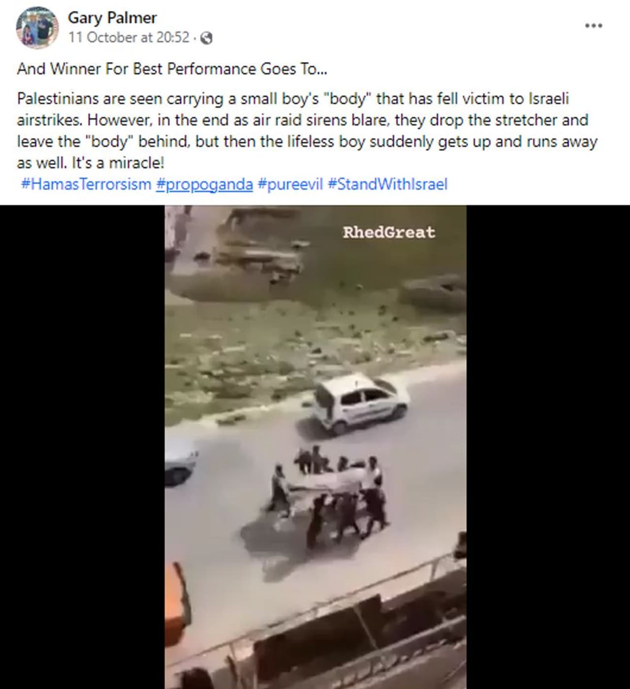 2023 ഒക്ടോബര് ഏഴാം തിയതിയാണ് ഗാസയില് നിന്ന് ഹമാസ് ഇസ്രയേലിലേക്ക് ആക്രമണം അഴിച്ചുവിട്ടത്. ഇതിന് പിന്നാലെ ഇസ്രയേല് കനത്ത പ്രത്യാക്രമണം ഗാസയില് നടത്തിക്കൊണ്ടിരിക്കുകയാണ്. ഇസ്രയേലിന്റെ തിരിച്ചടിയില് ഗാസയില് നിരവധി ജീവനുകള് പൊലിഞ്ഞു എന്നാണ് റിപ്പോര്ട്ടുകള്. ഇതിന്റെ തുടര്ച്ചയെന്നോളമാണ് ഫേസ്ബുക്കില് ഒരു വീഡിയോ പ്രത്യക്ഷപ്പെട്ടത്. പലസ്തീനികള് വ്യാജ ശവസംസ്കാര ചടങ്ങ് നടത്തുന്നതിന്റെ ദൃശ്യങ്ങളാണിത് എന്നുപറഞ്ഞാണ് ഗാരി പല്മാര് എന്നയാള് 27 സെക്കന്ഡ് ദൈര്ഘ്യമുള്ള വീഡിയോ 2023 ഒക്ടോബര് 11ന് എഫ്ബിയില് പോസ്റ്റ് ചെയ്തത്.