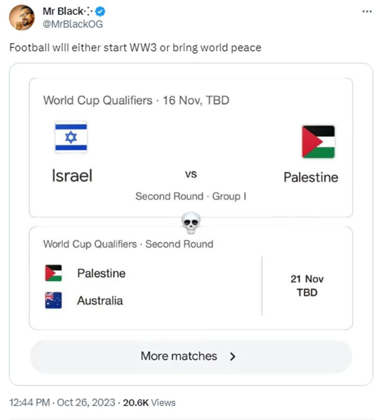 ഫിഫ ലോകകപ്പ് ക്വാളിഫയറില് ഇസ്രയേലും പലസ്തീനും 2023 നവംബര് 16ന് മുഖാമുഖം വരുന്നതായാണ് നിരവധി പേര് സാമൂഹ്യമാധ്യമങ്ങളില് ഷെയര് ചെയ്തിരിക്കുന്ന ഫിക്ച്ചറില് പറയുന്നത്. ലോകകപ്പ് യോഗ്യതാ റൗണ്ടില് ഗ്രൂപ്പ് ഐയിലെ രണ്ടാം റൗണ്ട് മത്സരമാണ് ഇതെന്ന് ഷെഡ്യൂളില് നല്കിയിരിക്കുന്നത് കാണാം. 2026 ഒക്ടോബര് 26-ാം തിയതി വന്ന ഒരു ട്വീറ്റ് ചുവടെ.