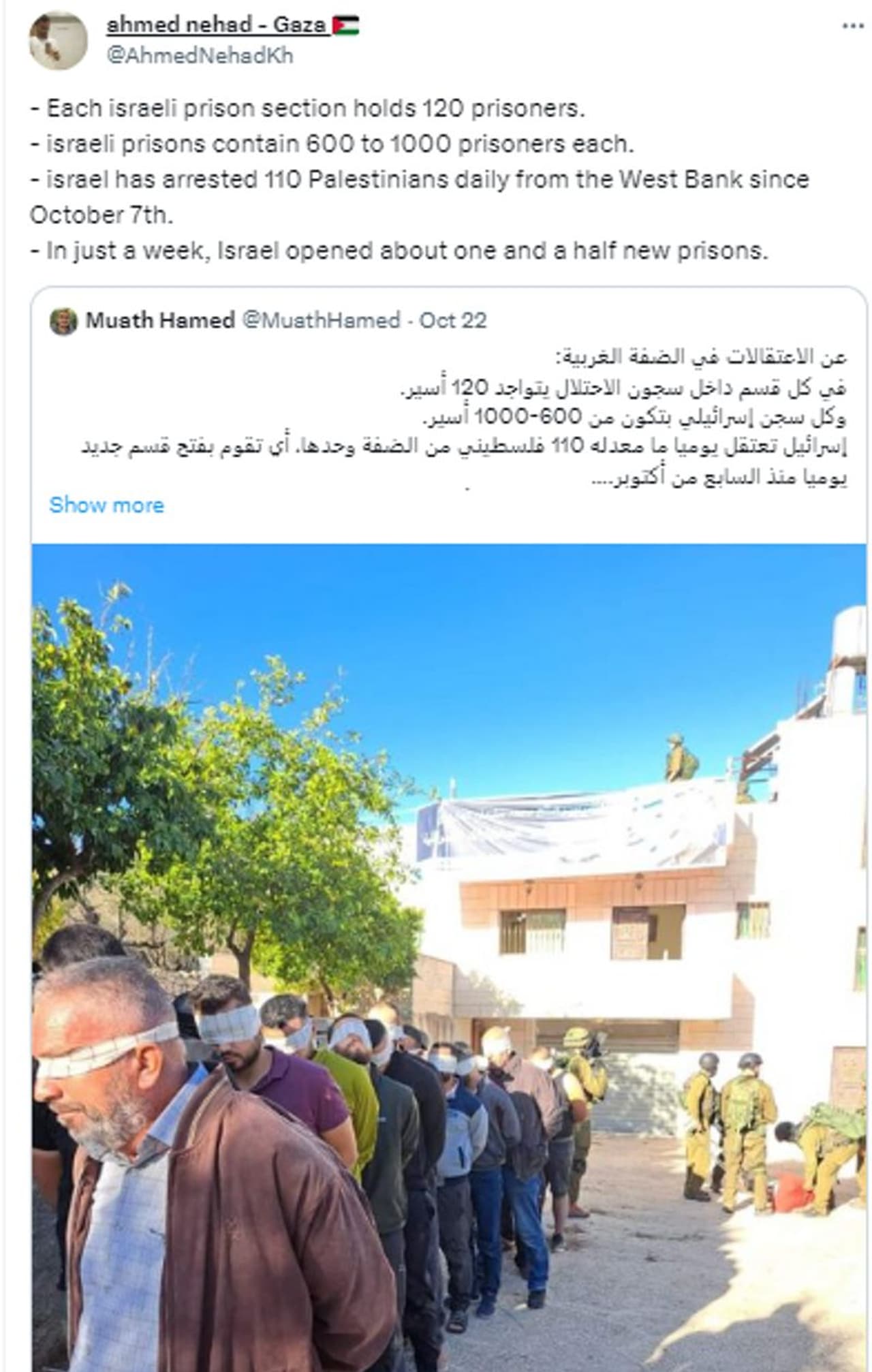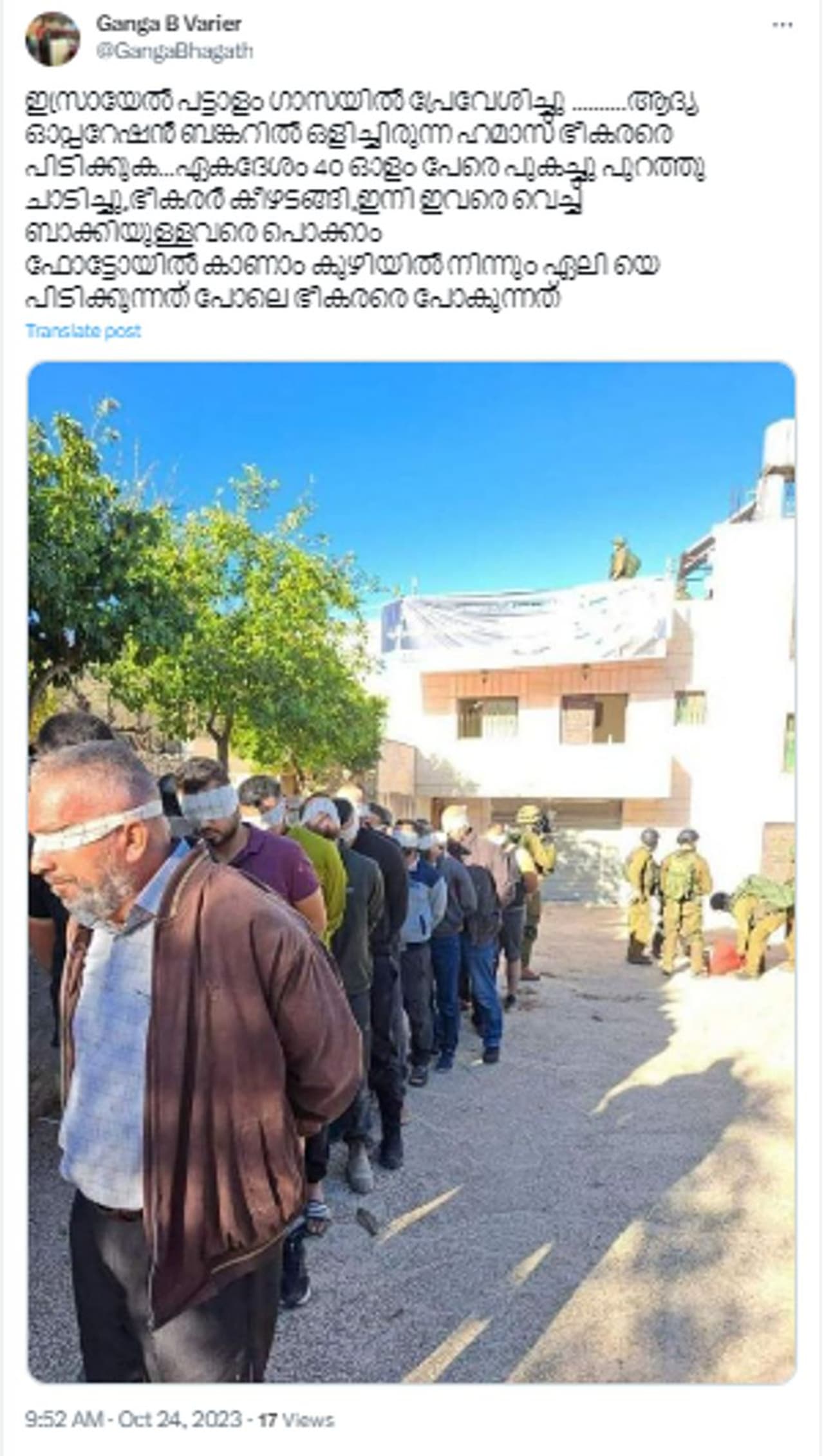 എന്നാല് ഇസ്രയേൽ സൈന്യം ഗാസയിലെ ബങ്കറുകളില് നിന്ന് പിടിച്ച ഹമാസ് ഭീകരുടെ ചിത്രം എന്ന പേരില് പ്രചരിക്കുന്ന ഫോട്ടോ തെറ്റിദ്ധരിപ്പിക്കുന്നതാണ് എന്നാണ് ഏഷ്യാനെറ്റ് ന്യൂസ് ഓണ്ലൈന് ഫാക്ട് ചെക്ക് ടീം കണ്ടെത്തിയത്. ഈ ഫോട്ടോ റിവേഴ്സ് ഇമേജ് സെര്ച്ചിന് വിധേയമാക്കിയപ്പോഴാണ് ഇക്കാര്യം വ്യക്തമായത്. ഗാസയില് നിന്നല്ല, വെസ്റ്റ് ബാങ്കില് നിന്ന് ഇസ്രയേല് സൈന്യം പിടികൂടിയ പലസ്തീനികളുടെ ചിത്രമാണിത് എന്നാണ് റിവേഴ്സ് ഇമേജ് സെര്ച്ചില് ലഭിച്ച വിവിധ ട്വീറ്റുകളില് പറയുന്നത്. 2023 ഒക്ടോബര് 21-ാം തിയതി ചെയ്തിട്ടുള്ള ട്വീറ്റില് പറയുന്നത് വെസ്റ്റ് ബാങ്കിലെ പലസ്തീന് പട്ടണമായ റാമല്ലയ്ക്ക് അടുത്ത അറോറ ഗ്രാമത്തില് നിന്നാണ് ഇവരെ ഇസ്രയേല് സേന പിടികൂടിയത് എന്നാണ്. ട്വീറ്റുകളുടെ സ്ക്രീന്ഷോട്ട് ചുവടെ.