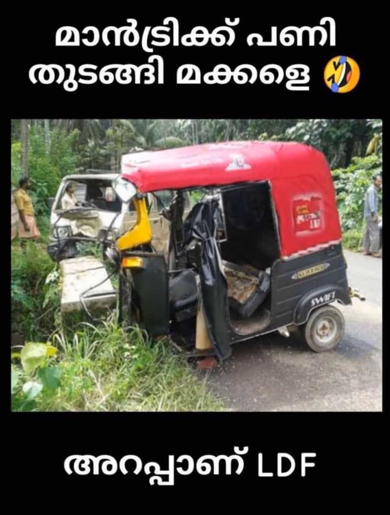 'ഉറപ്പാണ് എല്ഡിഎഫ്' എന്ന പോസ്റ്റര് സ്ഥാപിച്ച ഓട്ടോറിക്ഷ അപകടത്തില്പ്പെട്ടതായാണ് പ്രചാരണം.