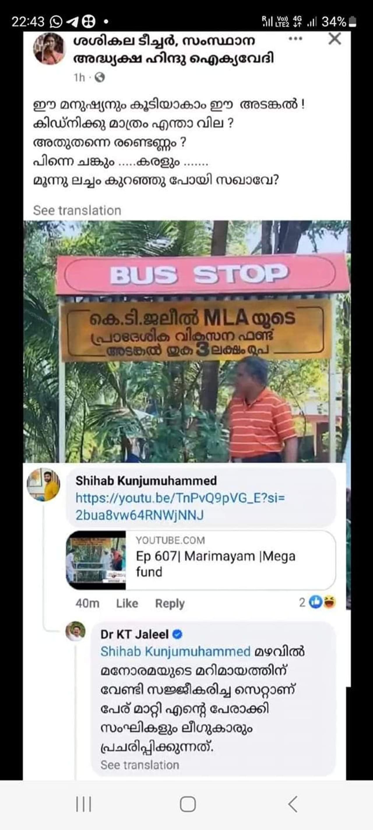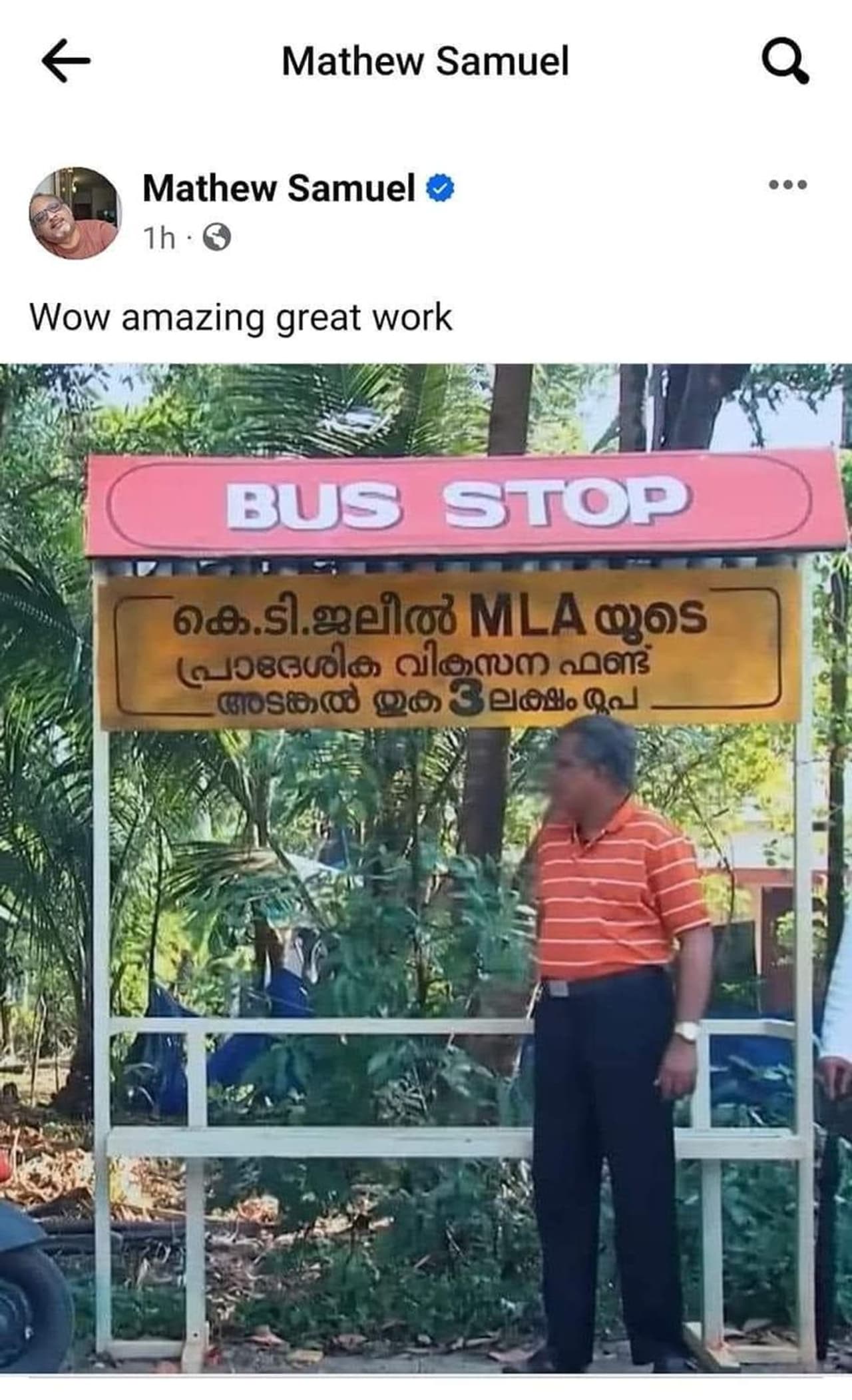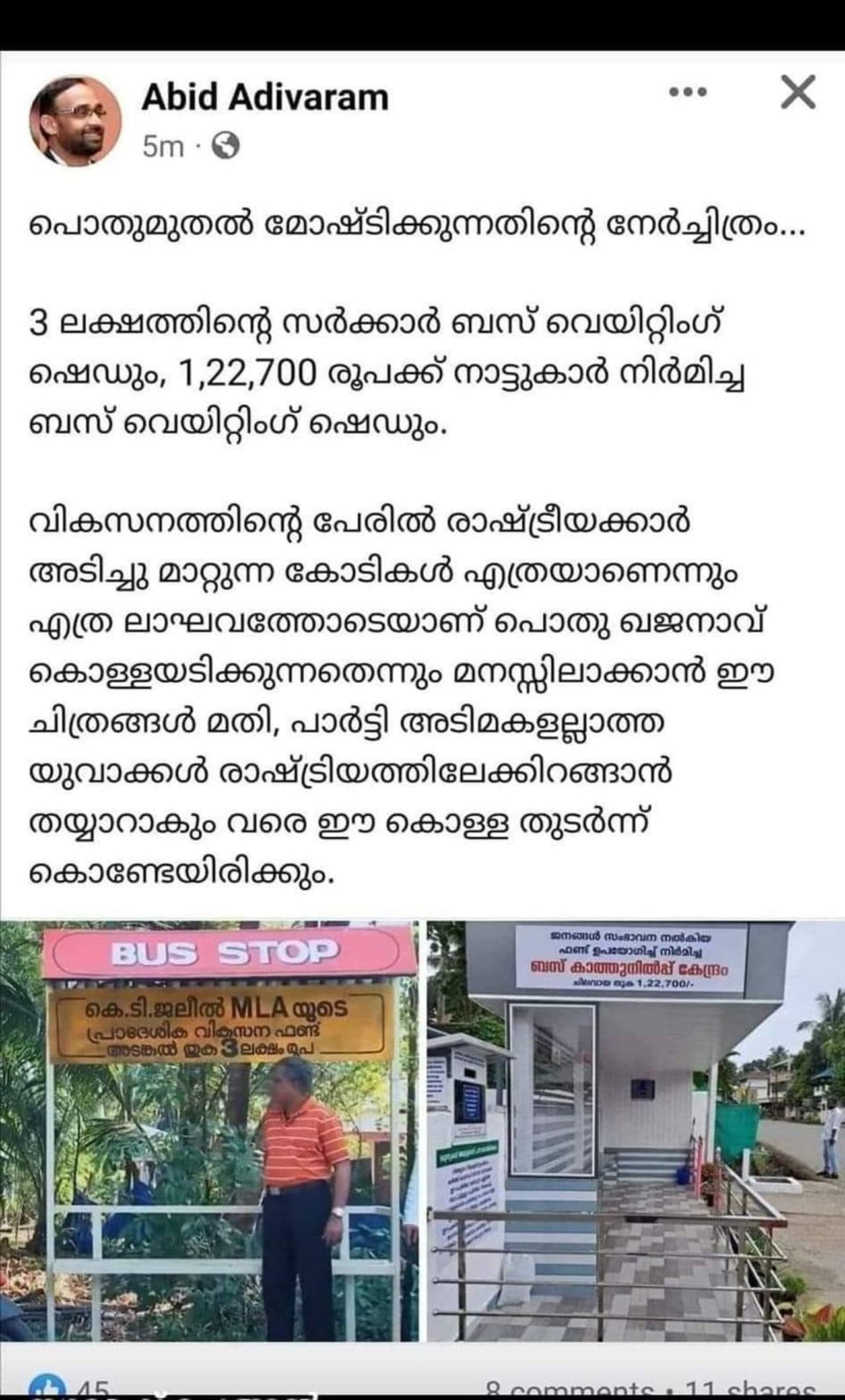 കെ.ടി. ജലീല് എംഎല്എയുടെ പ്രാദേശിക വികസന ഫണ്ടില് നിന്ന് അടങ്കല് തുകയായ 3 ലക്ഷം രൂപയ്ക്ക് നിർമ്മിച്ച ബസ് വെയിറ്റിംഗ് ഷെഡ് എന്ന പേരിലാണ് ചിത്രം പ്രചരിക്കുന്നത്. 'മൂന്ന് ലക്ഷത്തിന്റെ സര്ക്കാര് ബസ് വെയിറ്റിംഗ് ഷെഡും 1,22,700 രൂപയ്ക്ക് നാട്ടുകാര് നിര്മ്മിച്ച ബസ് വെയിറ്റിംഗ് ഷെഡും' എന്ന തലക്കെട്ടോടെ ആബിദ് അടിവാരം എന്നയാളാണ് ഫേസ്ബുക്കില് ചിത്രം പങ്കുവെച്ചവരില് ഒരാള് (ഈ ചിത്രം നീക്കം ചെയ്തിട്ടുണ്ട്, പോസ്റ്റ് എഡിറ്റ് ചെയ്തതായി എഡിറ്റ് ഹിസ്റ്ററിയില് കാണാം). പൊതുമുതല് മോഷ്ടിക്കുന്നതിന്റെ നേര്ച്ചിത്രമാണിത് എന്നും ആബിദ് പറയുന്നു. 'ശശികല ടീച്ചര്, സംസ്ഥാന അദ്ധ്യക്ഷ ഹിന്ദു ഐക്യവേദി' എന്ന എഫ്ബി പേജിലും ബസ് സ്റ്റോപ്പിന്റെ ചിത്രം സഹിതം പോസ്റ്റ് പ്രത്യക്ഷപ്പെട്ടു. 'വൗ, അമേസിംഗ് ഗ്രേറ്റ് വര്ക്ക്' എന്ന തലക്കെട്ടില് മാത്യൂ സാമുവല് എന്നയാളും ബസ് വെയിറ്റിംഗ് ഷെഡിന്റെ ചിത്രം ഫേസ്ബുക്കില് പങ്കുവെച്ചിട്ടുണ്ട് (ഈ പോസ്റ്റ് ഇപ്പോള് കാണാനില്ല). മൂന്ന് പോസ്റ്റുകള്ക്കും വലിയ റീച്ച് ഫേസ്ബുക്കില് ലഭിച്ചിരുന്നു.