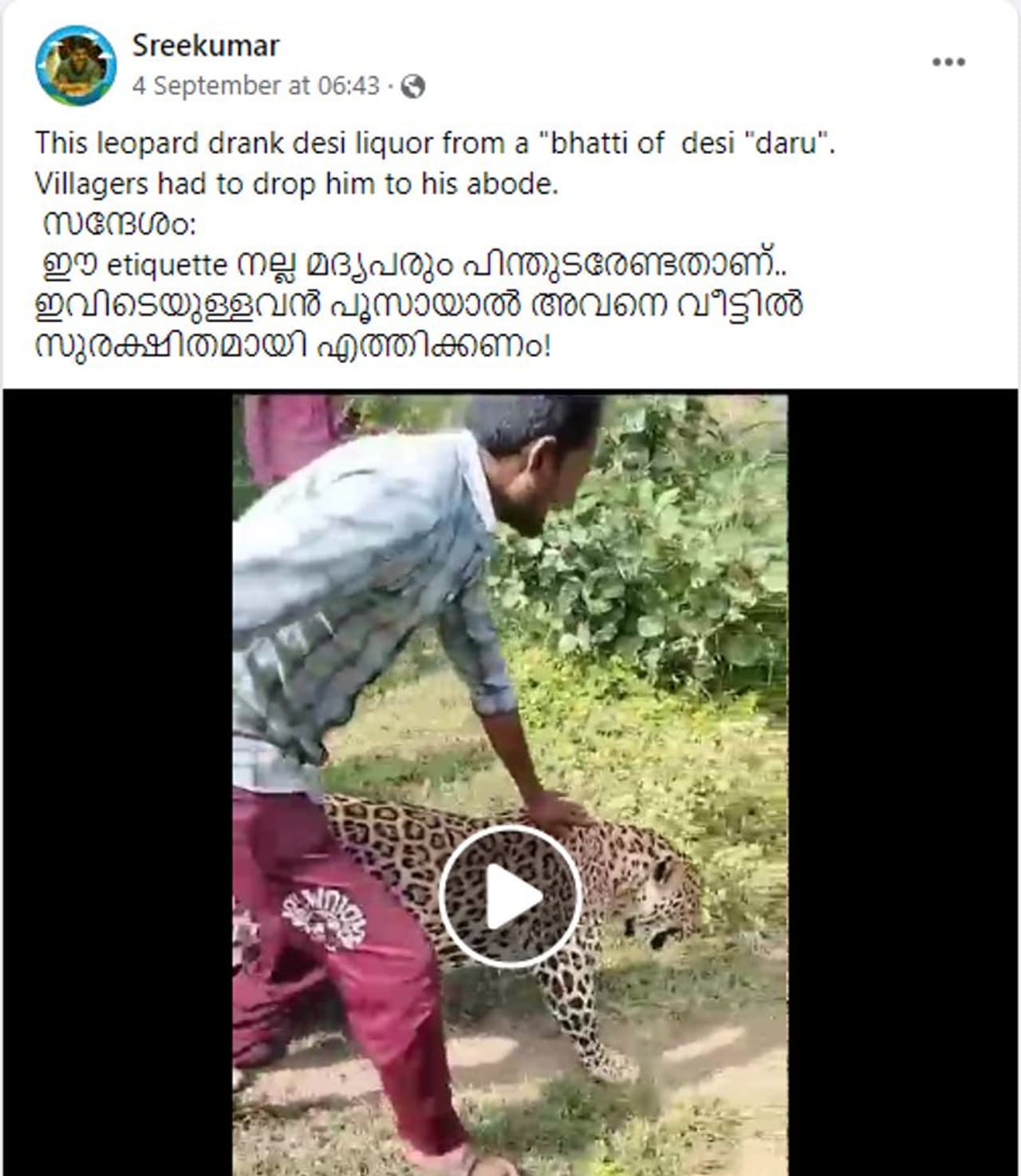 കേരളത്തിലുള്പ്പടെ ഫേസ്ബുക്കിലൂടെ വൈറലായിരിക്കുന്ന വീഡിയോയാണ് സംഭവം. അവശത തോന്നിക്കുന്ന ഒരു പുള്ളിപ്പുലിയെ നാട്ടുകാര് പൂച്ചക്കുട്ടിയെ പോലെ താലേലിക്കുന്നതാണ് വീഡിയോയില് കാണുന്നത്. 'ഈ പുള്ളിപ്പുലി മദ്യം കഴിച്ച് പൂസായി. ഗ്രാമവാസികള് അതിനെ വാസസ്ഥലത്തെത്താന് സഹായിക്കുകയാണ്. ഈ നല്ല മര്യാദ എല്ലാവരും കാണിക്കേണ്ടതാണ്. ഇവിടെയുള്ളവര് പൂസായാല് അവനെ വീട്ടില് സുരക്ഷിതമായി എത്തിക്കണം' എന്നാണ് മലയാളത്തിലുള്ള കുറിപ്പ് സഹിതം ഒരാള് ഫേസ്ബുക്കില് വീഡിയോ പങ്കുവെച്ചത്. ഫേസ്ബുക്കിന് പുറമെ ട്വിറ്ററിലും നിരവധി പേര് വീഡിയോ പങ്കുവെച്ചിരിക്കുന്നത് കാണാം.