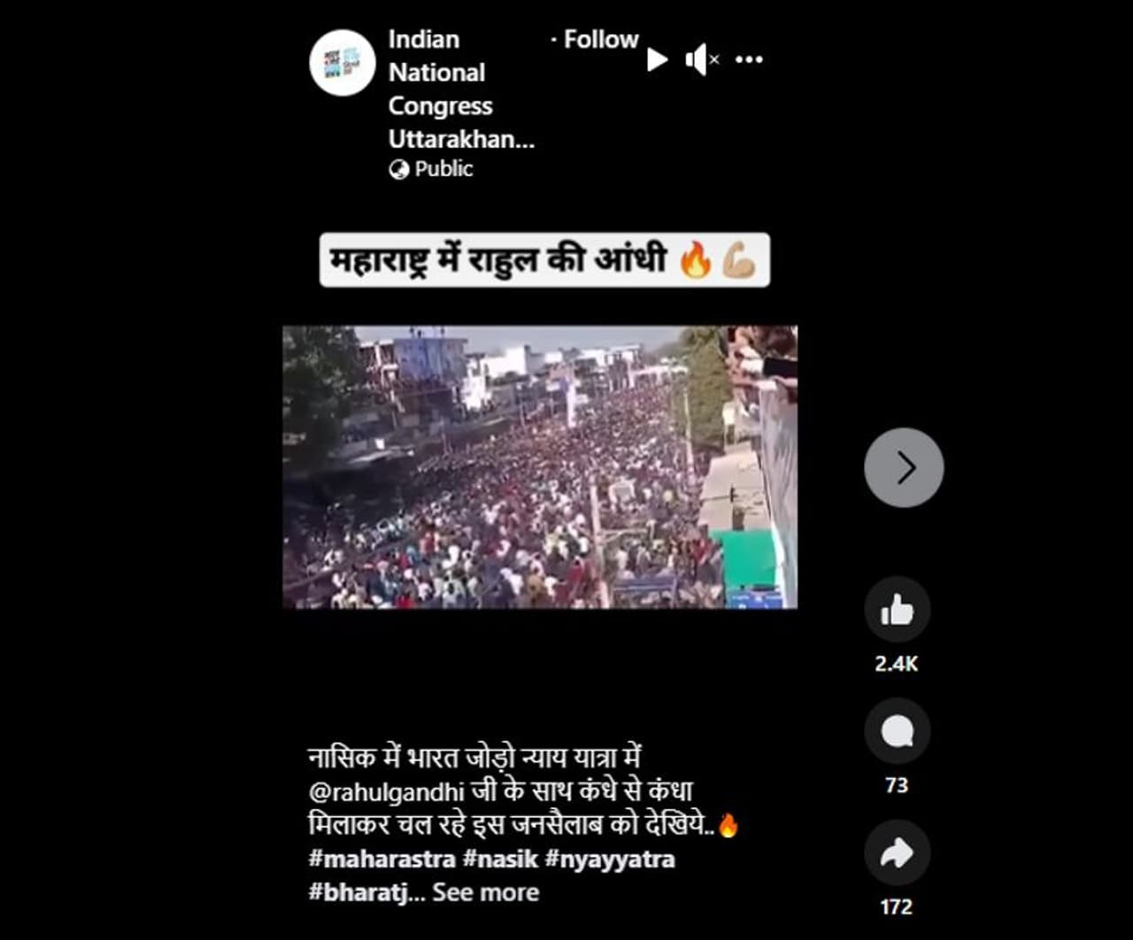 ഇന്ത്യന് നാഷണല് കോണ്ഗ്രസ് ഉത്തരാഖണ്ഡിന്റെ ഫേസ്ബുക്ക് പേജില് നിന്നാണ് വീഡിയോ 2024 മാര്ച്ച് 14-ാം തിയതി പങ്കുവെച്ചിരിക്കുന്നത്. നൂറുകണക്കിനാളുകള് വീഡിയോ ഇതിനകം കണ്ടുകഴിഞ്ഞു. 'മഹാരാഷ്ട്രയിലെ ഭാരത് ജോഡോ ന്യായ് യാത്രയിൽ രാഹുൽ ഗാന്ധിയുടെ തോളോട് തോൾ ചേർന്ന് പോകുന്ന ജനക്കൂട്ടത്തെ കാണൂ'- എന്ന തലക്കെട്ടിലാണ് വീഡിയോ പോസ്റ്റ് ചെയ്തിരിക്കുന്നത്. നാസിക് എന്ന ഹാഷ്ടാഗും പോസ്റ്റില് കാണാം. മഹാരാഷ്ട്രയിലെ നഗരമാണ് നാസിക്.