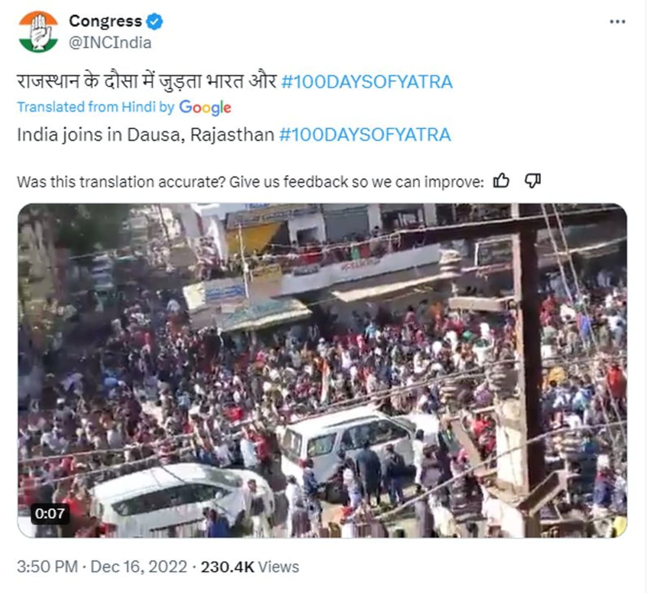 വീഡിയോ പങ്കുവെച്ച ഉത്തരാഖണ്ഡ് ഇന്ത്യന് നാഷണല് കോണ്ഗ്രസ് അവകാശപ്പെടുന്നത് പോലെയല്ല വീഡിയോയുടെ യാഥാര്ഥ്യം. 2022 ഡിസംബറില് രാജസ്ഥാനില് നടന്ന കോണ്ഗ്രസിന്റെ ഭാരത് ജോഡോ യാത്രയില് നിന്നുള്ള ദൃശ്യങ്ങളാണിത്. ഇപ്പോള് പ്രചരിക്കുന്ന വീഡിയോയുടെ ഫ്രെയിമുകള് റിവേഴ്സ് ഇമേജ് സെര്ച്ചിന് വിധേയമാക്കിയതിലൂടെയാണ് ഇക്കാര്യം ബോധ്യപ്പെട്ടത്. വീഡിയോയുടെ ഒറിജിനല് കോണ്ഗ്രസ് ഔദ്യോഗിക എക്സ് അക്കൗണ്ടില് നിന്ന് 2022 ഡിസംബര് 16ന് പങ്കുവെച്ചിട്ടുള്ളതാണ് എന്ന് ചുവടെ കാണാം. രാജസ്ഥാനിലെ ദൗസയില് നിന്നുള്ള ദൃശ്യമാണിത് എന്ന് ട്വീറ്റില് വ്യക്തമായി പറഞ്ഞിട്ടുണ്ട്. അതിനാല് തന്നെ വീഡിയോ മഹാരാഷ്ട്രയില് നിന്നുള്ളതല്ല എന്ന് വ്യക്തം.