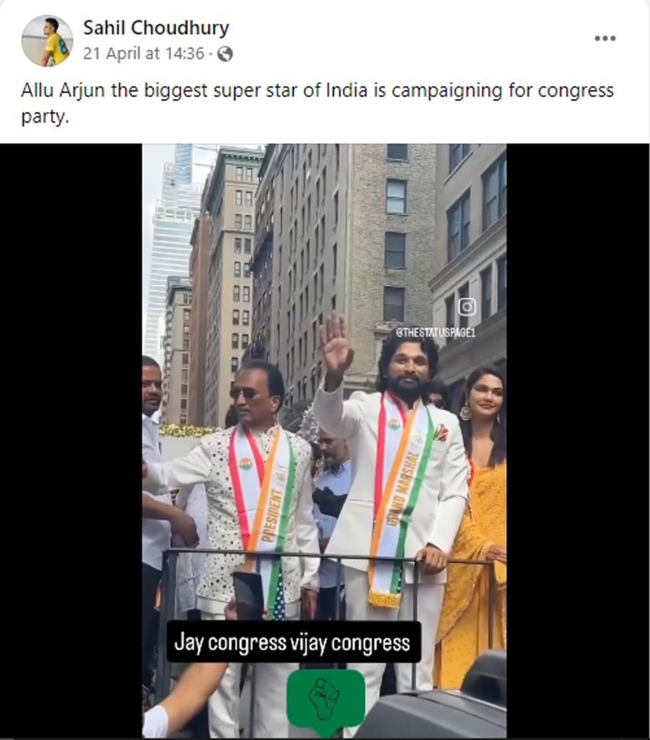 അല്ലു അര്ജുന് ലോക്സഭ തെരഞ്ഞെടുപ്പ് 2024ല് കോണ്ഗ്രസിനായി പ്രചാരണത്തിനിറങ്ങി എന്നാണ് ഈ പ്രചാരണം