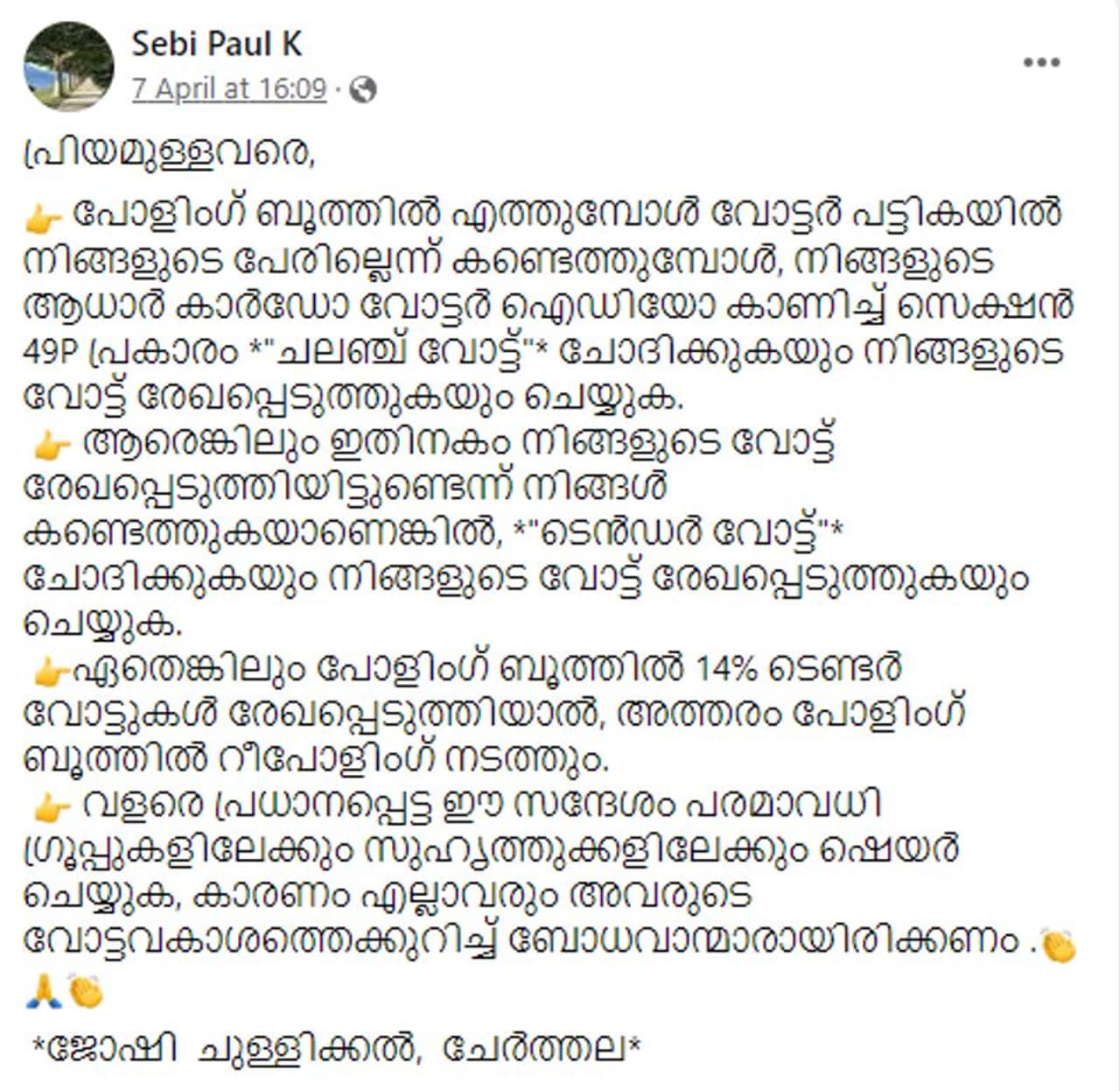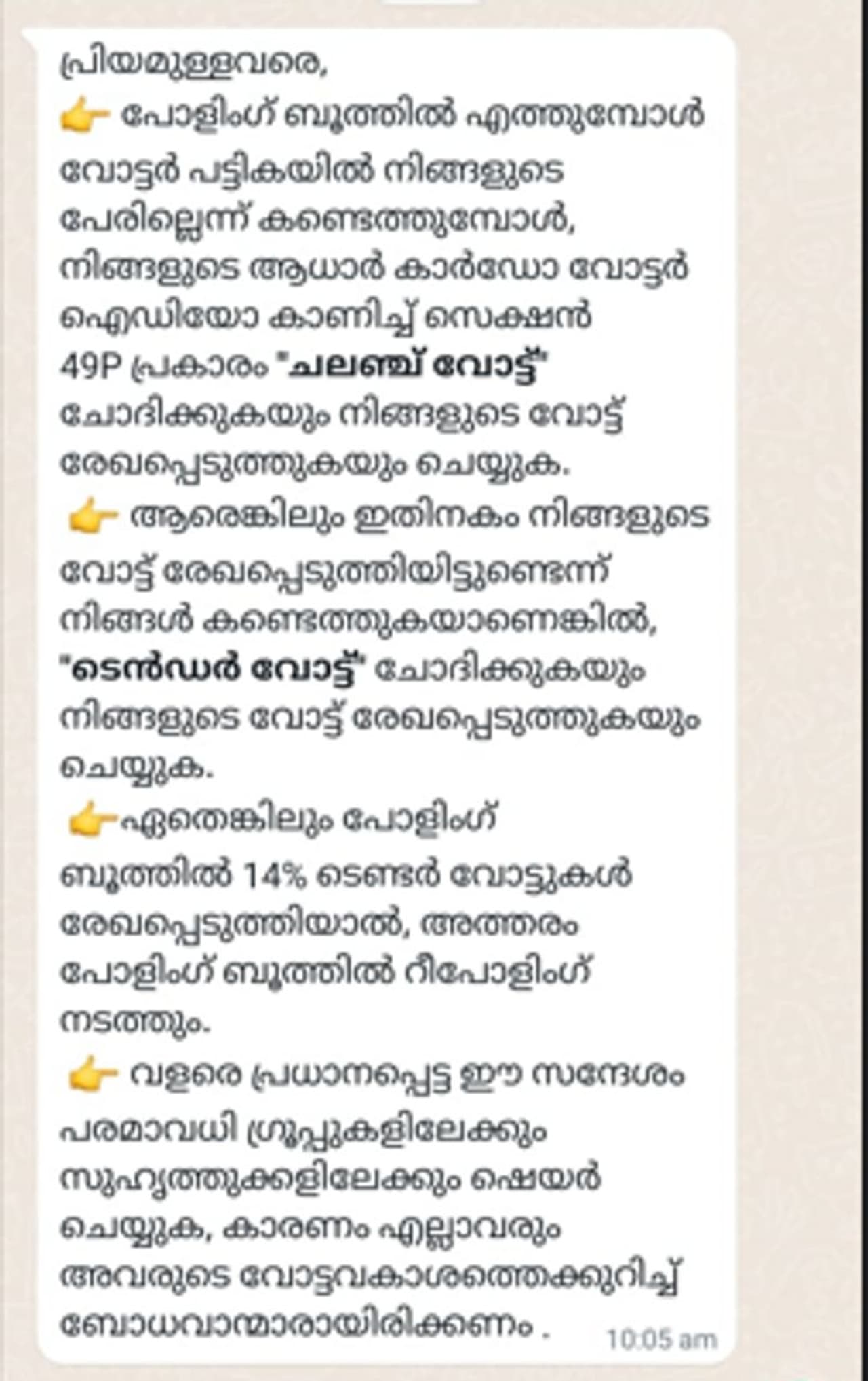 👉 വളരെ പ്രധാനപ്പെട്ട ഈ സന്ദേശം പരമാവധി ഗ്രൂപ്പുകളിലേക്കും സുഹൃത്തുക്കളിലേക്കും ഷെയർ ചെയ്യുക, കാരണം എല്ലാവരും അവരുടെ വോട്ടവകാശത്തെക്കുറിച്ച് ബോധവാന്മാരായിരിക്കണം .👏🙏👏