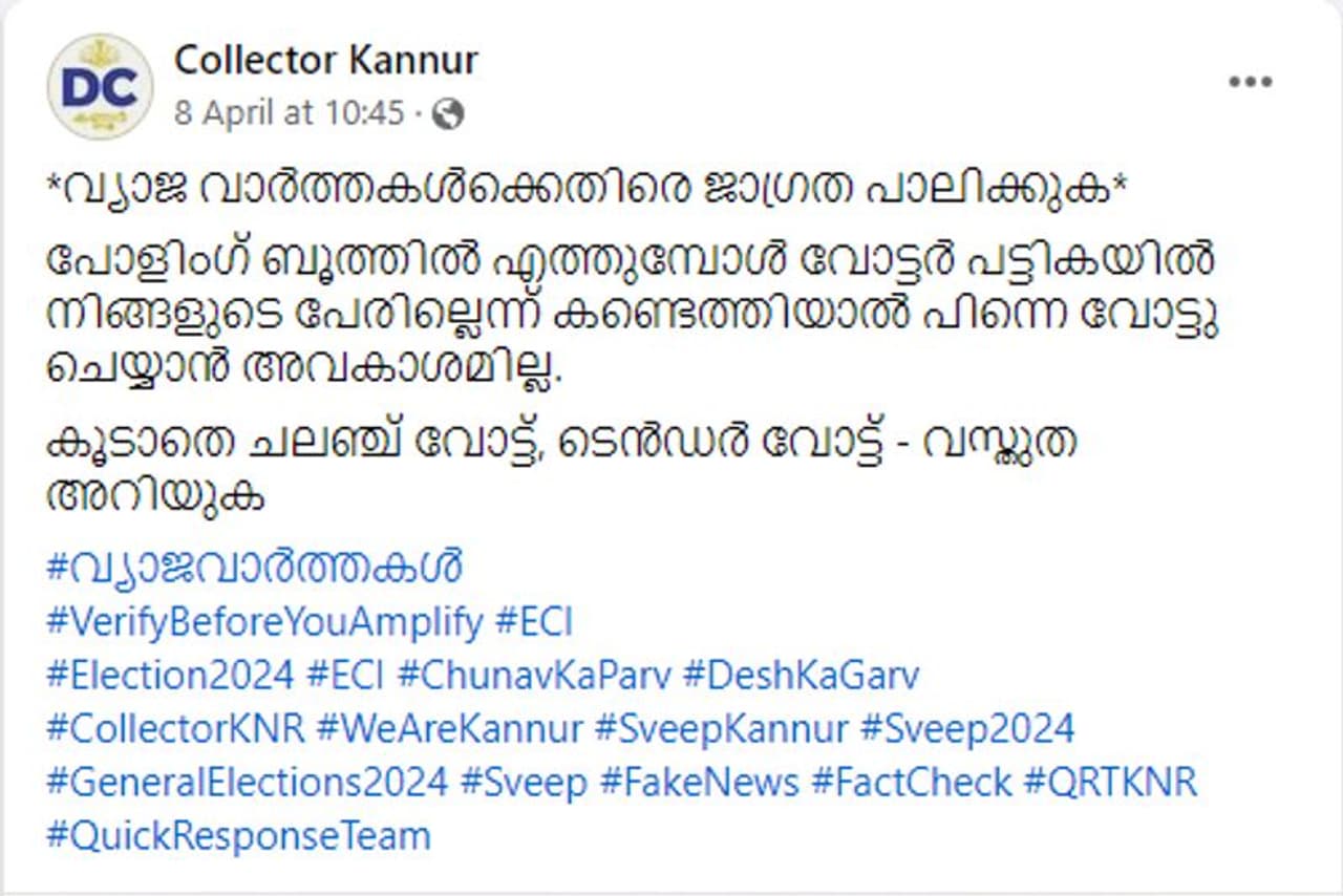 പ്രചരിക്കുന്ന സന്ദേശത്തിന്റെ വസ്തുത അറിയാന് നടത്തിയ കീവേഡ് സെര്ച്ചില് കണ്ണൂര് കലക്ടറുടെ ഫേസ്ബുക്ക് പേജില് 2024 ഏപ്രില് എട്ടിന് പങ്കുവെച്ചിരിക്കുന്ന പോസ്റ്റ് കാണാനായി. വോട്ടര് പട്ടികയില് പേരില്ലെങ്കിലും വോട്ട് ചെയ്യാമെന്ന പ്രചാരണം തെറ്റാണ് എന്ന് ഈ കുറിപ്പില് പറയുന്നു. ചലഞ്ച് വോട്ട്, ടെൻഡർ വോട്ട് എന്നിവ എന്താണ് എന്ന് കണ്ണൂര് കലക്ടറുടെ പേജില് വിശദീകരിക്കുന്നുണ്ട്.