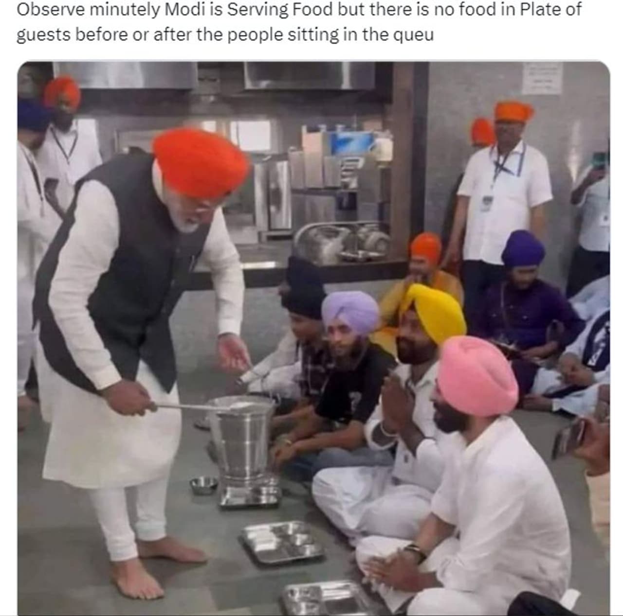 'ബിഗ് ബ്രേക്കിംഗ്- നരേന്ദ്ര മോദി തുറന്നുകാട്ടപ്പെടുന്നു. നരേന്ദ്ര മോദി സേവനം ചെയ്യുകയല്ല. പഞ്ചാബിലെ വരുന്ന ലോക്സഭ തെരഞ്ഞടുപ്പിനായി അദേഹം ഫോട്ടോഷൂട്ട് നടത്തുകയാണ്. മോദി ഭക്ഷണം വിളമ്പുന്നത് ശ്രദ്ധിച്ചാല്, അദേഹത്തിന്റെ കയ്യിലെ ബക്കറ്റിലോ കഴിക്കാനായി ക്യൂവില് ഇരിക്കുന്നവരുടെ പാത്രങ്ങളിലോ ഭക്ഷണം കാണാനാവുന്നില്ല'- എന്നുമുള്ള കുറിപ്പോടെയാണ് ചിത്രം എക്സില് (പഴയ ട്വിറ്റര്) പോസ്റ്റ് ചെയ്തിരിക്കുന്നത്.
