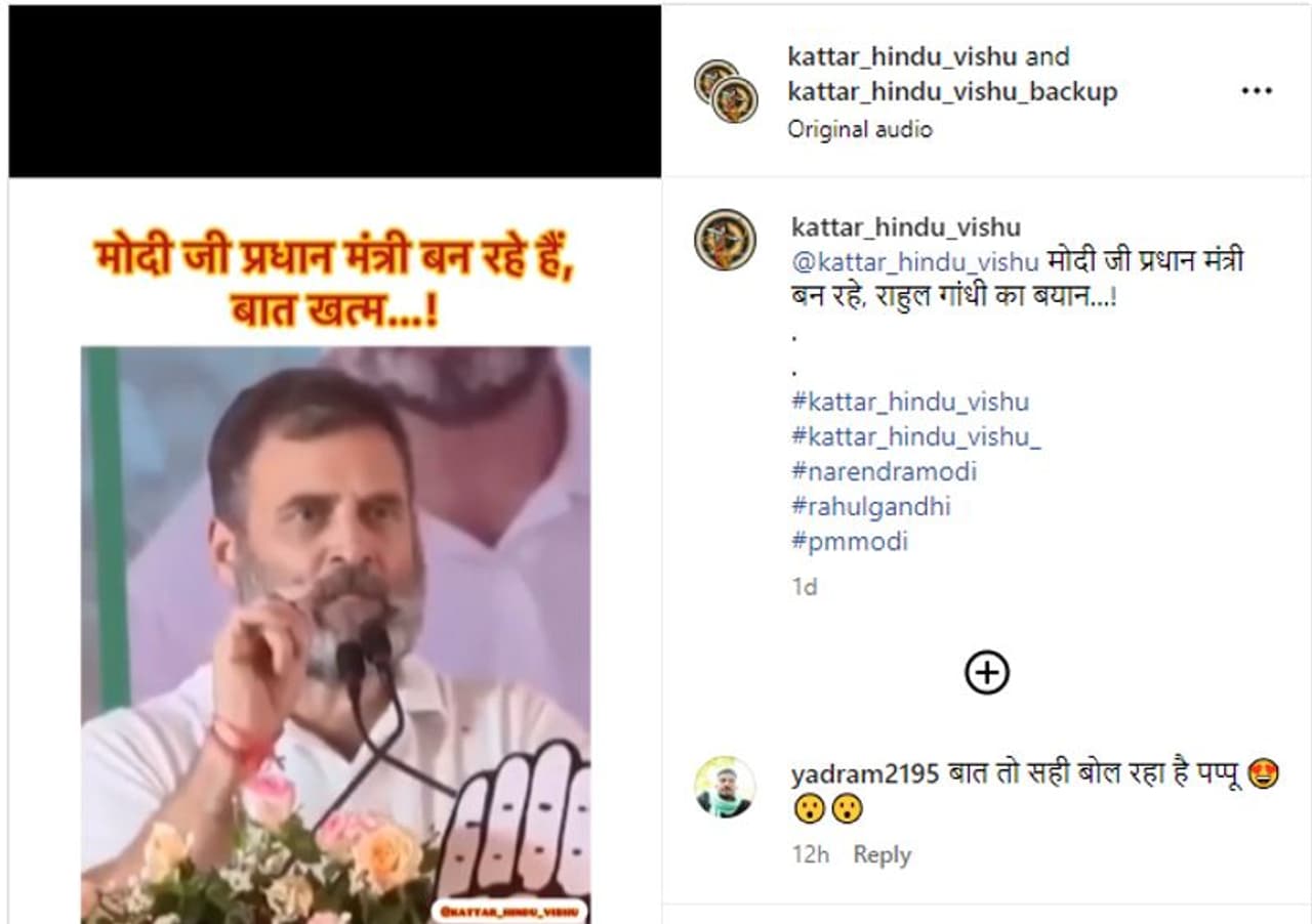 'നരേന്ദ്ര മോദി ഇന്ത്യയുടെ പ്രധാനമന്ത്രിയായി തുടരും. 2024 ജൂണ് നാലിന് മോദിയായിരിക്കും ഇന്ത്യന് പ്രധാനമന്ത്രി. തെരഞ്ഞെടുപ്പില് എല്ലാ ശ്രമങ്ങളും ഞങ്ങള് നടത്തി. ഇന്ത്യാ മുന്നണി ഉത്തര്പ്രദേശില് ഒരു സീറ്റ് പോലും നേടാന് പോകുന്നില്ല'- എന്നിങ്ങനെ രാഹുലിന്റെ പ്രസംഗം നീളുന്നതായാണ് വൈറല് വീഡിയോ.