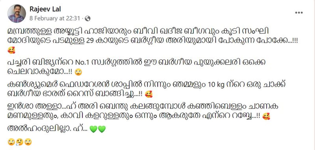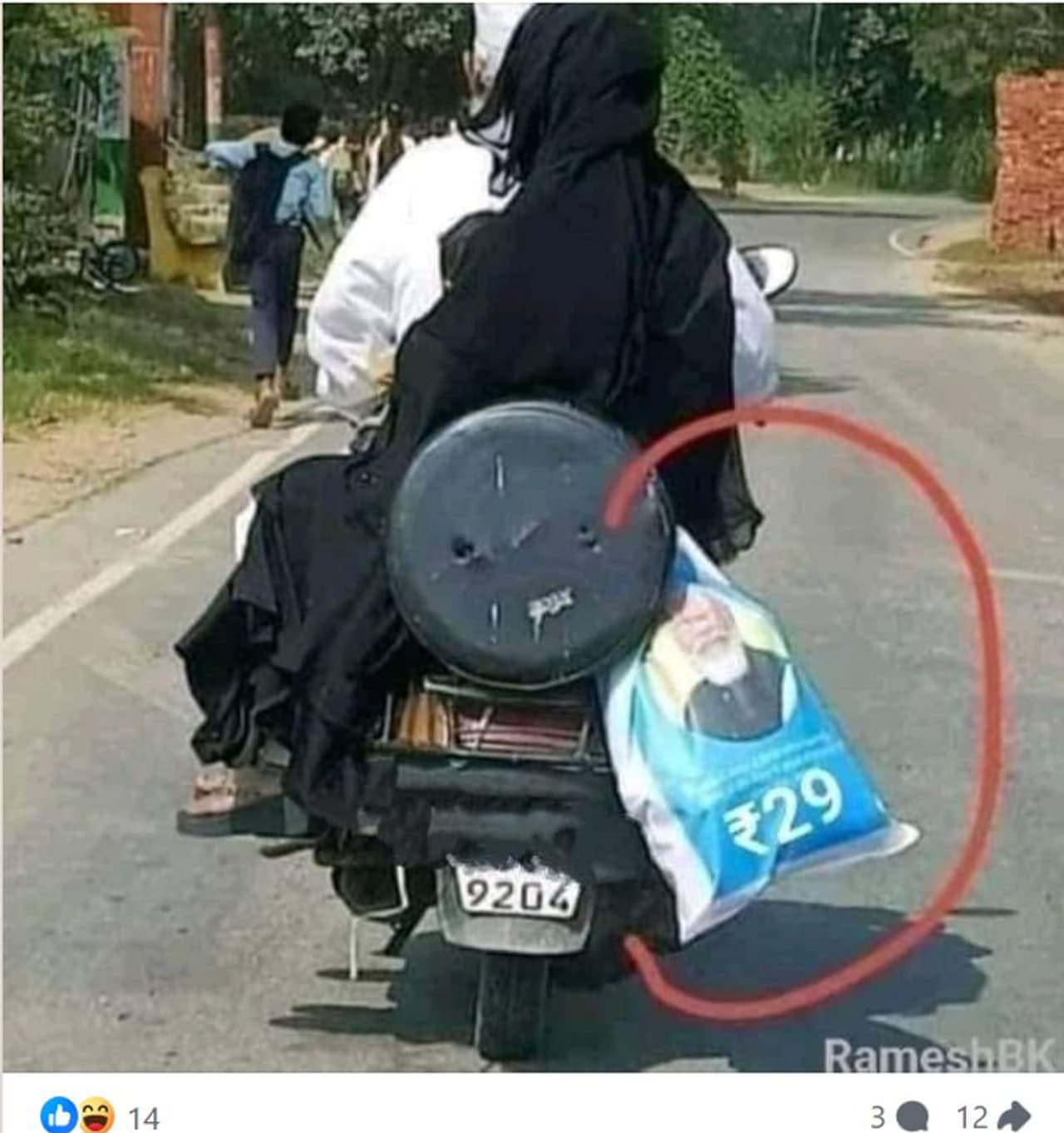മുസ്ലീംകളായ രണ്ട് പേർ നരേന്ദ്ര മോദിയുടെ ചിത്രം ആലേഖനം ചെയ്ത ഒരു സഞ്ചിയുമായി സ്കൂട്ടറില് യാത്ര ചെയ്യുന്നതിന്റെ ഫോട്ടോയാണ് ഫേസ്ബുക്കില് രാജീവ് ലാല് എന്ന വ്യക്തി പോസ്റ്റ് ചെയ്തിരിക്കുന്നത്. 2024 ഫെബ്രുവരി 8-ാം തിയതിയാണ് ഈ പോസ്റ്റ് പ്രത്യക്ഷപ്പെട്ടത്. വാഹനത്തില് കാണുന്ന പാക്കറ്റില് 29 രൂപ എന്ന് എഴുതിയിരിക്കുന്നത് കാണാം. വർഗീയമായ കുറിപ്പോടെയാണ് ചിത്രം ഫേസ്ബുക്കില് പോസ്റ്റ് ചെയ്തിരിക്കുന്നത്.