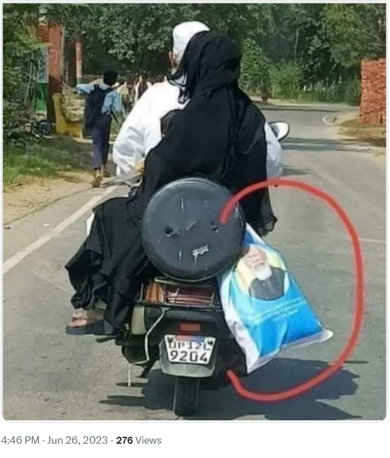 മുസ്ലീംകളായ രണ്ട് പേർ നരേന്ദ്ര മോദിയുടെ മുഖം ആലേഖനം ചെയ്ത ഒരു സഞ്ചിയുമായി സ്കൂട്ടറില് യാത്ര ചെയ്യുന്നതിന്റെ ഫോട്ടോയാണ് ഫേസ്ബുക്കില് പ്രചരിക്കുന്നത്