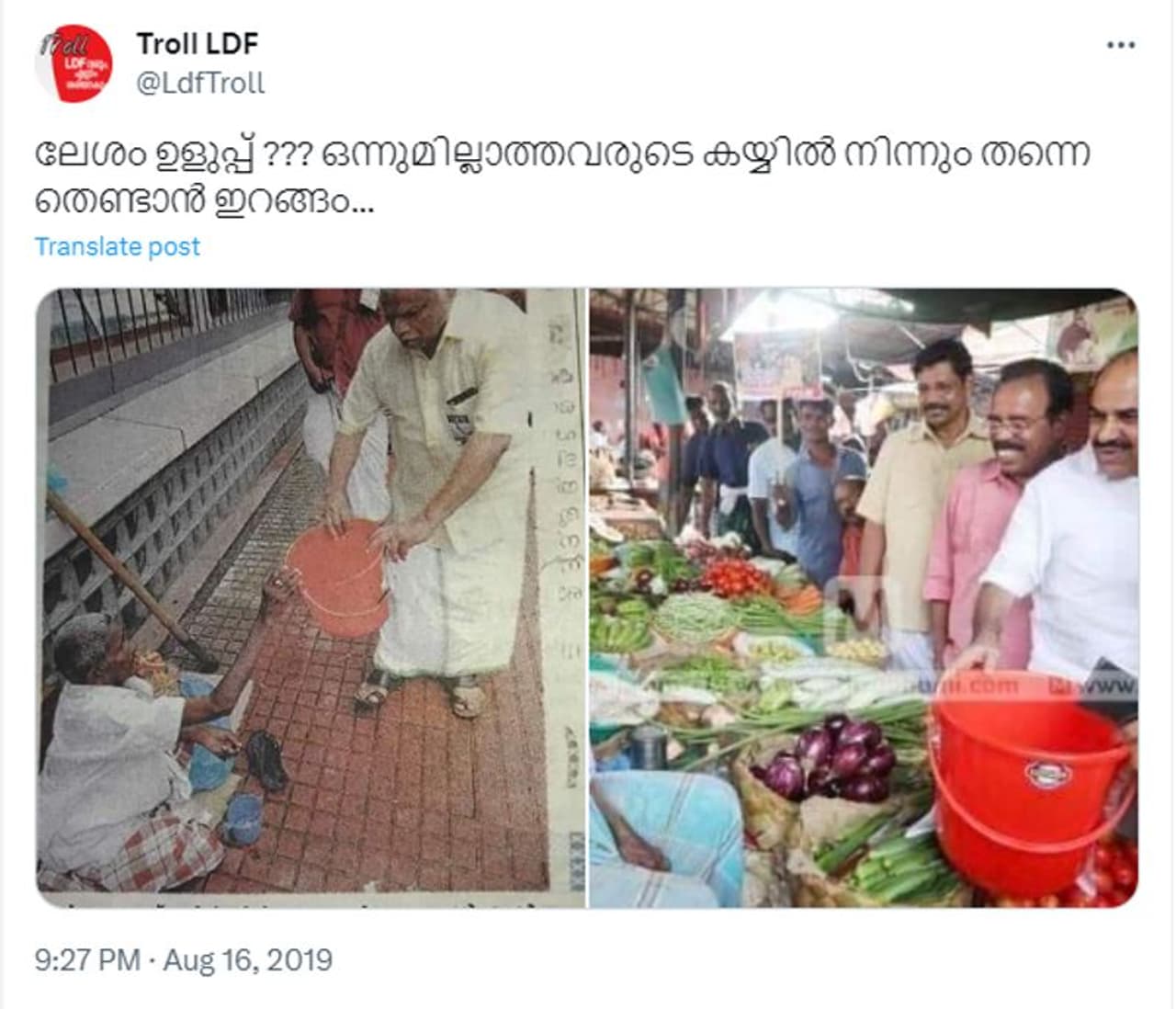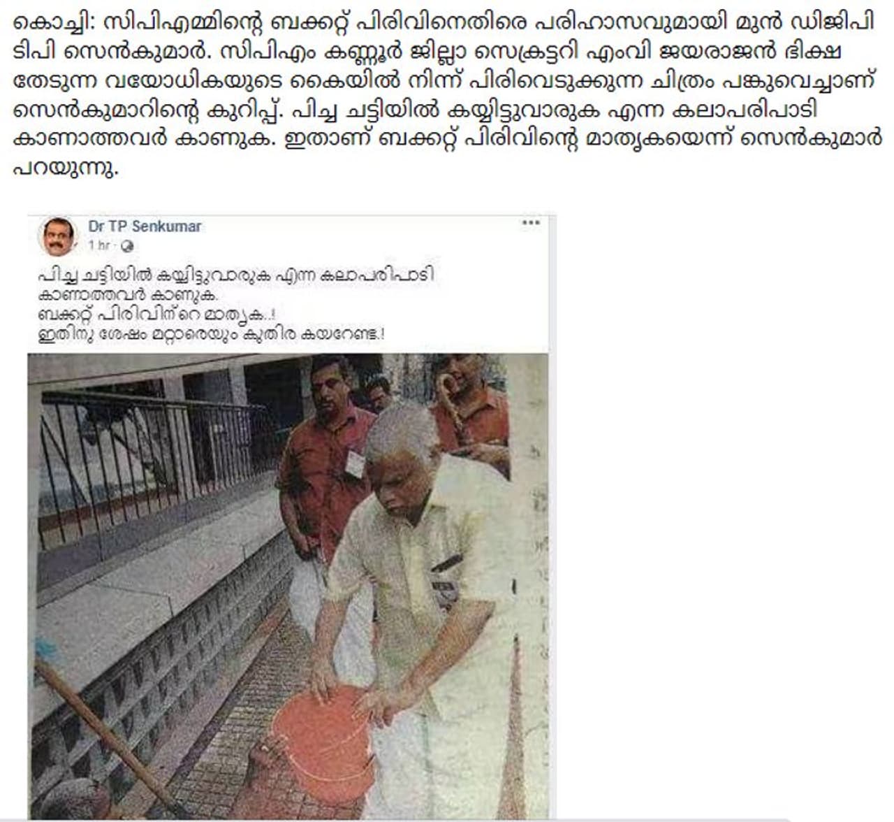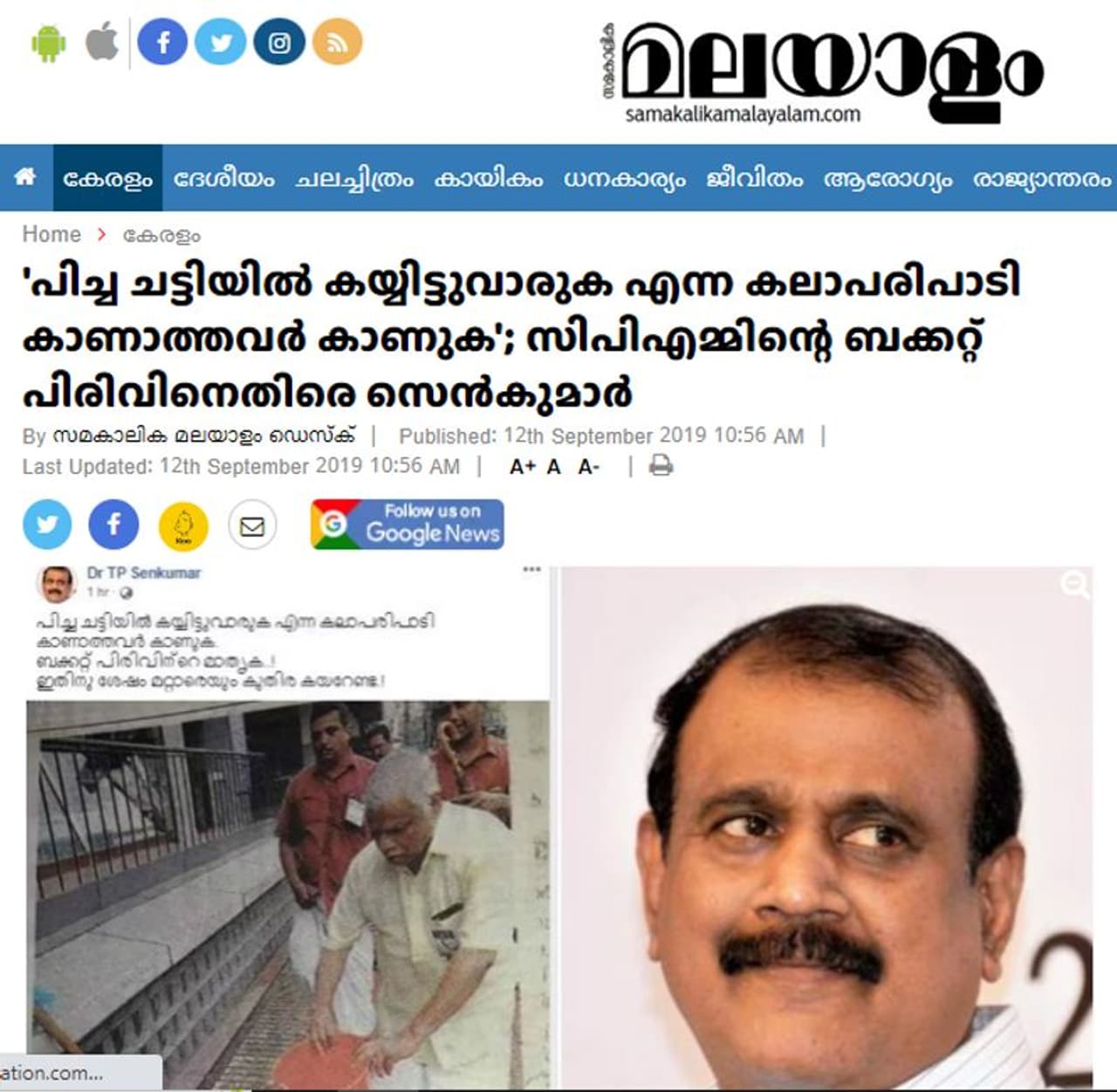 മാത്രമല്ല, എം വി ജയരാജന് ബക്കറ്റ് പിരിവ് നടത്തുന്ന ചിത്രം സഹിതമുള്ള ഒരു വാര്ത്ത 2019 സെപ്റ്റംബര് 12ന് സമകാലിക മലയാളം ഓണ്ലൈനില് പ്രസിദ്ധീകരിച്ചതും റിവേഴ്സ് ഇമേജ് സെര്ച്ചില് കണ്ടെത്താനായി. സിപിഎമ്മിന്റെ ബക്കറ്റ് പിരിവിനെതിരെ മുന് ഡിജിപി ടി പി സെന്കുമാര് നടത്തിയ വിമര്ശനത്തെ കുറിച്ചുള്ള വാര്ത്തയിലാണ് ഈ ചിത്രവുമുള്ളത്. 'പിച്ച ചട്ടിയില് കയ്യിട്ടുവാരുക എന്ന കലാപരിപാടി കാണാത്തവര് കാണുക'; സിപിഎമ്മിന്റെ ബക്കറ്റ് പിരിവിനെതിരെ സെന്കുമാര് എന്ന തലക്കെട്ടിലാണ് സമകാലിക മലയാളം വാര്ത്ത പ്രസിദ്ധീകരിച്ചത്.