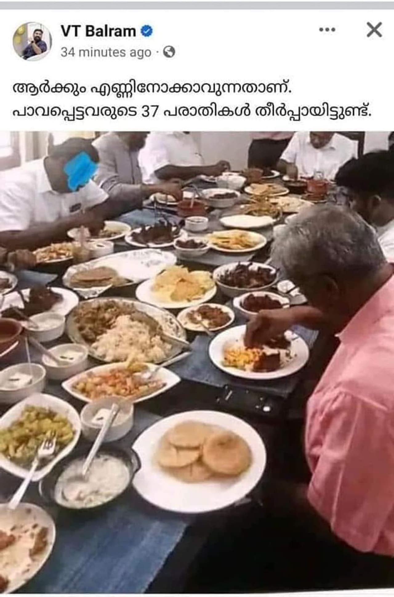 'ആര്ക്കും എണ്ണിനോക്കാവുന്നതാണ്. പാവപ്പെട്ടവരുടെ 37 പരാതികള് തീര്പ്പാക്കിയിട്ടുണ്ട്' എന്ന കുറിപ്പോടെയാണ് കോണ്ഗ്രസ് നേതാവ് വി ടി ബല്റാം വെരിഫൈഡ് ഫേസ്ബുക്ക് അക്കൗണ്ടില് ചിത്രം പോസ്റ്റ് ചെയ്തത്. മുഖ്യമന്ത്രി പിണറായി വിജയന് കുറച്ച് പേര്ക്കൊപ്പം ഒരു മേശയ്ക്ക് ചുറ്റുമിരുന്ന് ഭക്ഷണം കഴിക്കുന്നതിന്റെ ചിത്രമായിരുന്നു ഇത്. തീന്മേശയില് അനവധി ഭക്ഷണസാധനങ്ങള് നിരത്തിവച്ചിരിക്കുന്നത് ചൂണ്ടിക്കാട്ടിയാണ് പരിഹാസരൂപേണ വി ടി ബല്റാം ഈ ചിത്രം എഫ്ബിയില് പങ്കുവെച്ചത്.
