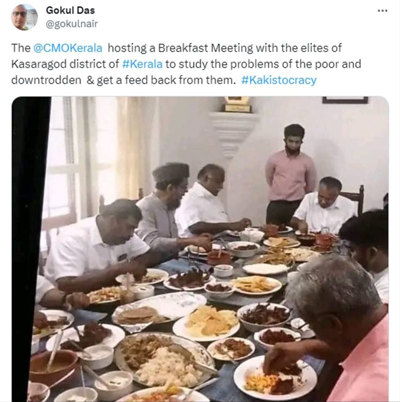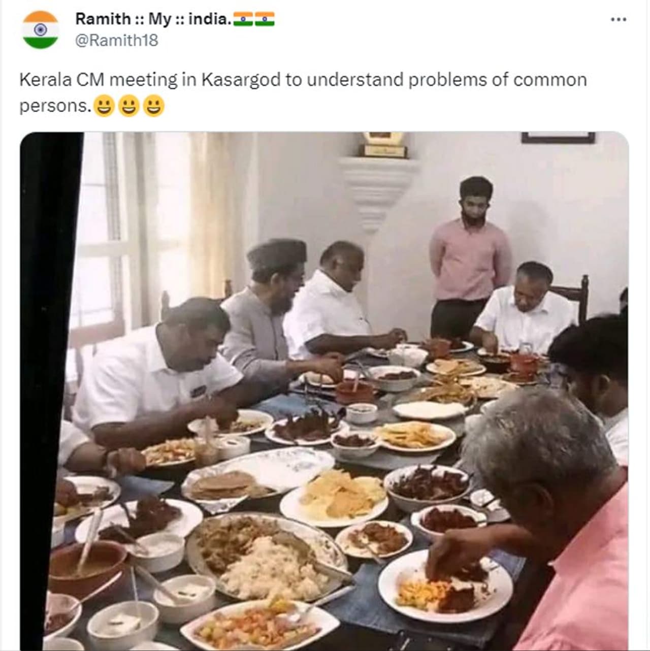 വി ടി ബല്റാം മാത്രമല്ല, മറ്റ് നിരവധി ആളുകളും ഫേസ്ബുക്കും ട്വിറ്ററും അടക്കമുള്ള സാമൂഹ്യമാധ്യമങ്ങളില് സമാന ചിത്രം പോസ്റ്റ് ചെയ്തിട്ടുണ്ട്. നവകേരള സദസിനിടെ കാസര്കോട് വച്ച് മുഖ്യമന്ത്രി പിണറായി വിജയന് സല്ക്കാരത്തില് പങ്കെടുക്കുന്നതിന്റെ ഫോട്ടോയാണിത് എന്ന അവകാശവാദത്തോടെയാണ് ഈ പോസ്റ്റുകളെല്ലാം. ഇത്തരത്തിലുള്ള രണ്ട് ട്വീറ്റുകളുടെ സ്ക്രീന്ഷോട്ടുകള് ചുവടെ കൊടുത്തിരിക്കുന്നു. 2023 നവംബര് 20, 21 തിയതികളിലാണ് ഈ ട്വീറ്റുകള് പ്രത്യക്ഷപ്പെട്ടത്.